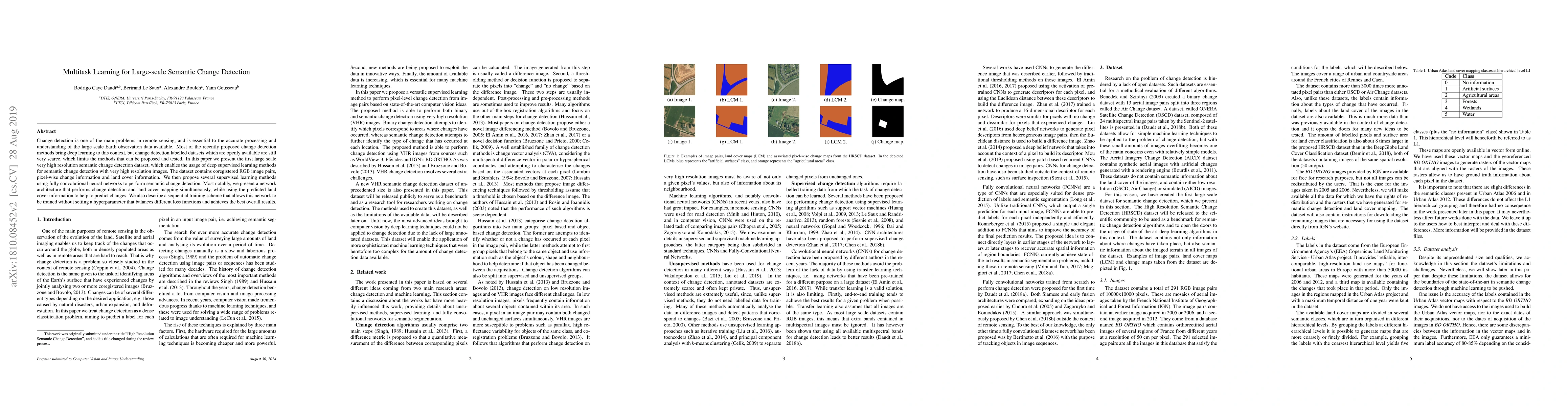 This paper introduces a large-scale high resolution semantic change detection dataset, enabling deep learning applications. It proposes a network architecture that simultaneously performs change detection and land cover mapping, achieving optimal results through a sequential training scheme without hyperparameter balancing.