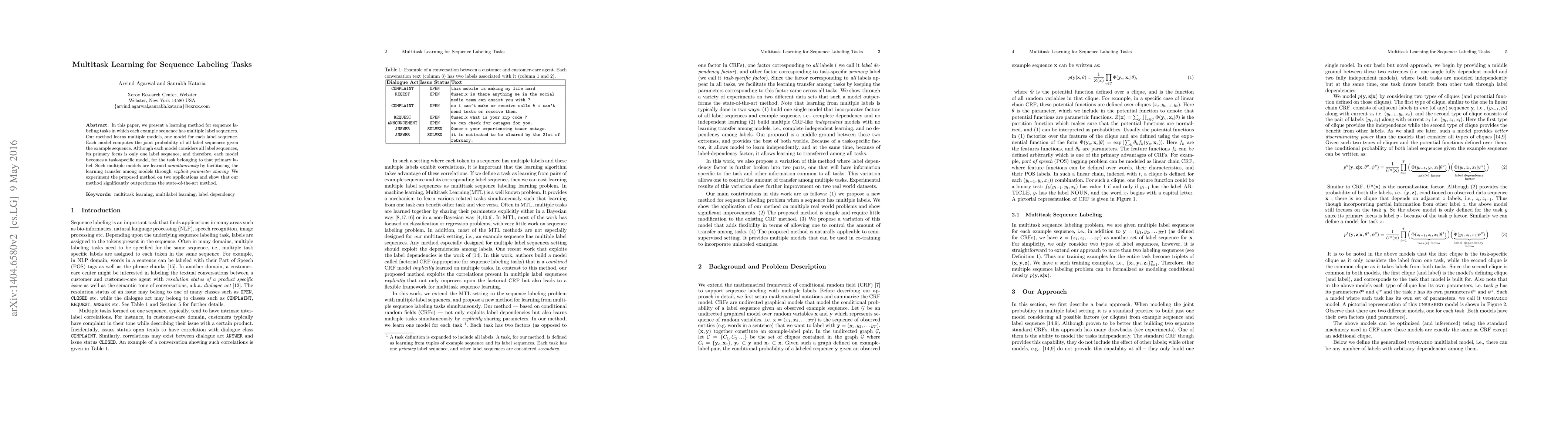In this paper, we present a learning method for sequence labeling tasks in which each example sequence has multiple label sequences. Our method learns multiple models, one model for each label sequence. Each model computes the joint probability of all label sequences given the example sequence. Although each model considers all label sequences, its primary focus is only one label sequence, and therefore, each model becomes a task-specific model, for the task belonging to that primary label. Such multiple models are learned {\it simultaneously} by facilitating the learning transfer among models through {\it explicit parameter sharing}. We experiment the proposed method on two applications and show that our method significantly outperforms the state-of-the-art method.
