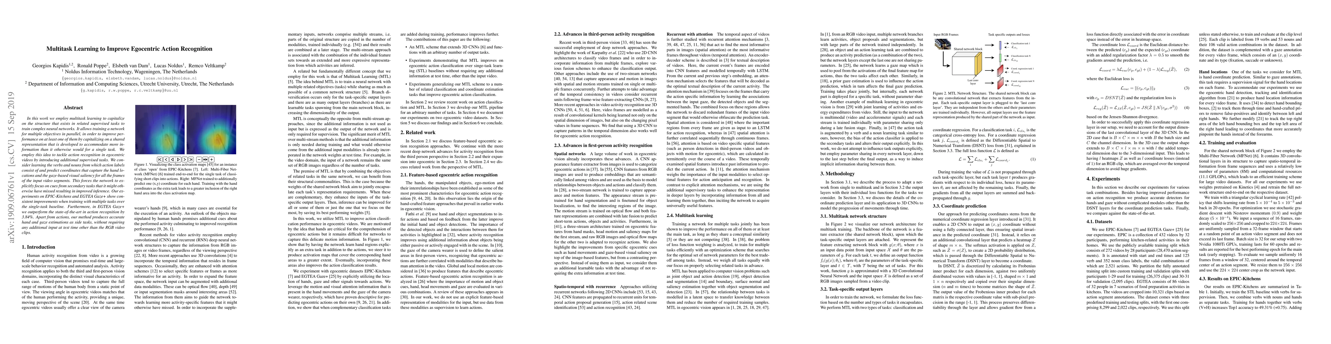 Researchers used multitask learning to improve action recognition in egocentric videos by training a neural network on multiple objectives, achieving consistent improvements over single-task baselines. The method also produced accurate hand and gaze estimations without requiring additional input at test time.