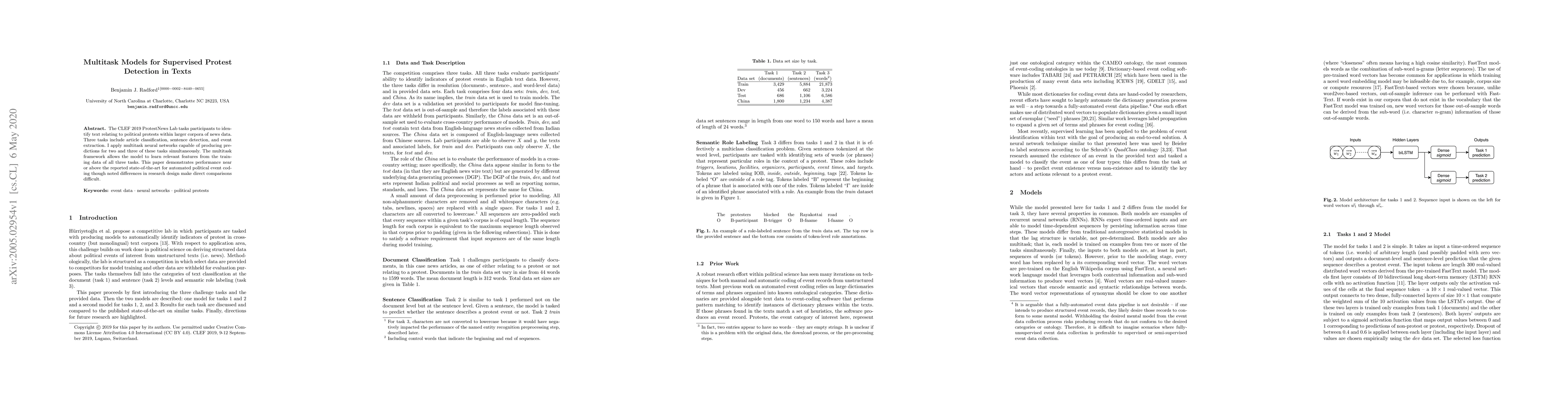 The CLEF 2019 ProtestNews Lab tasks participants to identify text relating to political protests within larger corpora of news data. Three tasks include article classification, sentence detection, and event extraction. I apply multitask neural networks capable of producing predictions for two and three of these tasks simultaneously. The multitask framework allows the model to learn relevant features from the training data of all three tasks. This paper demonstrates performance near or above the reported state-of-the-art for automated political event coding though noted differences in research design make direct comparisons difficult.