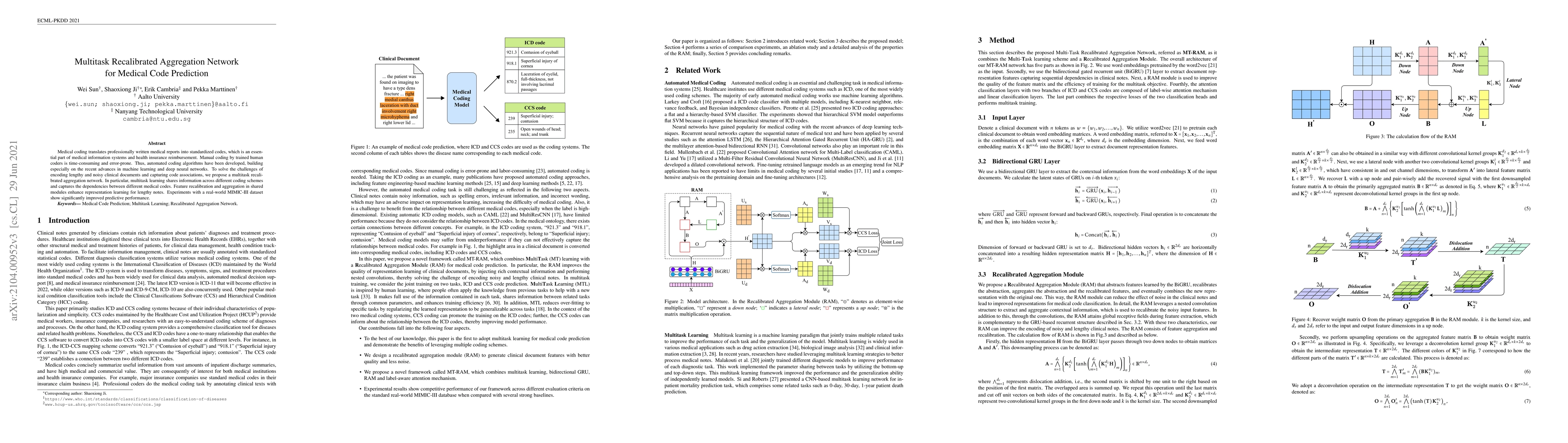 Medical coding translates professionally written medical reports into standardized codes, which is an essential part of medical information systems and health insurance reimbursement. Manual coding by trained human coders is time-consuming and error-prone. Thus, automated coding algorithms have been developed, building especially on the recent advances in machine learning and deep neural networks. To solve the challenges of encoding lengthy and noisy clinical documents and capturing code associations, we propose a multitask recalibrated aggregation network. In particular, multitask learning shares information across different coding schemes and captures the dependencies between different medical codes. Feature recalibration and aggregation in shared modules enhance representation learning for lengthy notes. Experiments with a real-world MIMIC-III dataset show significantly improved predictive performance.