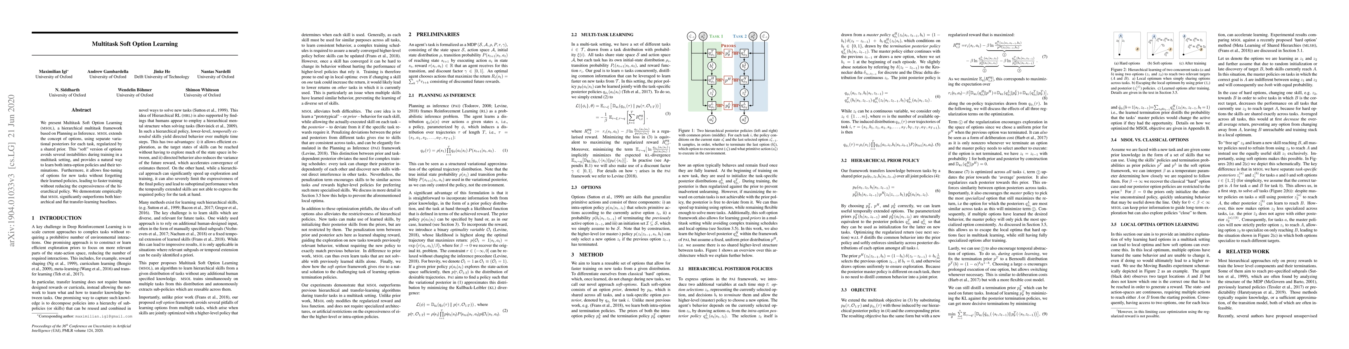 Multitask Soft Option Learning (MSOL) introduces a hierarchical framework that uses soft options with task-specific variational posteriors, regularized by a shared prior, to stabilize training and enable effective transfer learning. Empirical results show MSOL outperforms both hierarchical and flat transfer learning baselines.