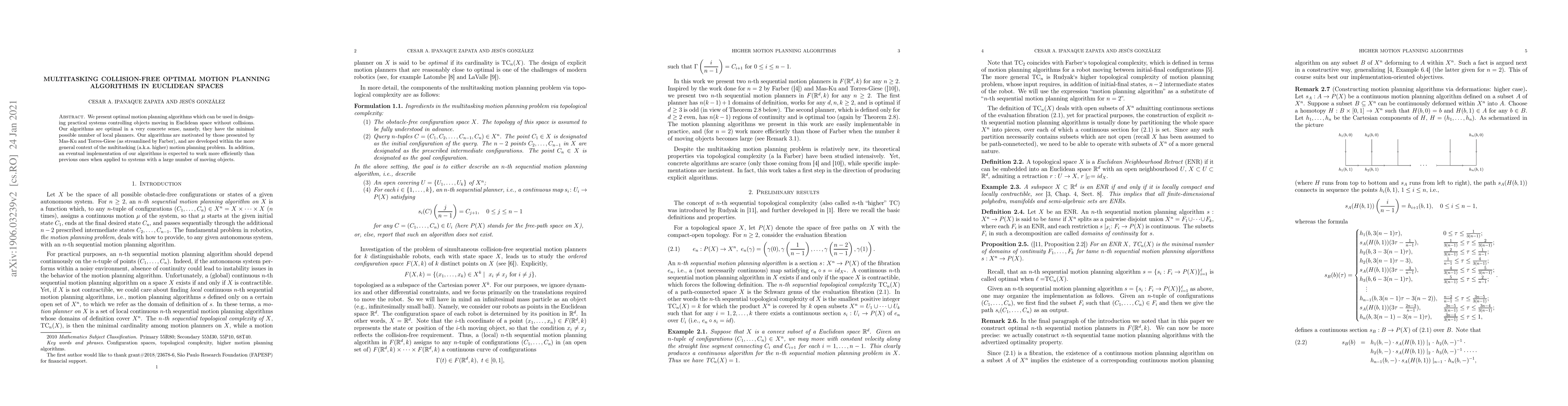 This paper introduces optimal multitasking collision-free motion planning algorithms for objects in Euclidean space, minimizing the number of local planners. Inspired by Mas-Ku and Torres-Giese, these algorithms aim for higher efficiency in systems with many moving objects.
