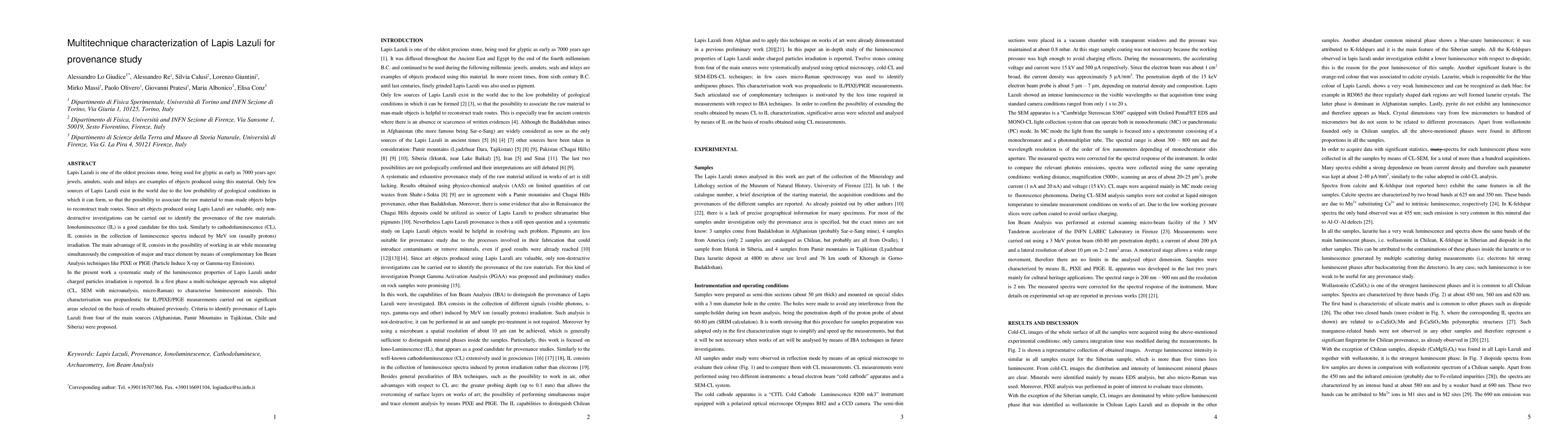 Lapis Lazuli is one of the oldest precious stone, being used for glyptic as early as 7000 years ago: jewels, amulets, seals and inlays are examples of objects produced using this material. Only few sources of Lapis Lazuli exist in the world due to the low probability of geological conditions in which it can form, so that the possibility to associate the raw material to man-made objects helps to reconstruct trade routes. Since art objects produced using Lapis Lazuli are valuable, only non-destructive investigations can be carried out to identify the provenance of the raw materials. Ionoluminescence (IL) is a good candidate for this task. Similarly to cathodoluminescence (CL), IL consists in the collection of luminescence spectra induced by MeV ion (usually protons) irradiation. The main advantage of IL consists in the possibility of working in air while measuring simultaneously the composition of major and trace element by means of complementary Ion Beam Analysis techniques like PIXE or PIGE (Particle Induce X-ray or Gamma-ray Emission). In the present work a systematic study of the luminescence properties of Lapis Lazuli under charged particles irradiation is reported. In a first phase a multi-technique approach was adopted (CL, SEM with microanalysis, micro-Raman) to characterise luminescent minerals. This characterisation was propaedeutic for IL/PIXE/PIGE measurements carried out on significant areas selected on the basis of results obtained previously. Criteria to identify provenance of Lapis Lazuli from four of the main sources (Afghanistan, Pamir Mountains in Tajikistan, Chile and Siberia) were proposed.