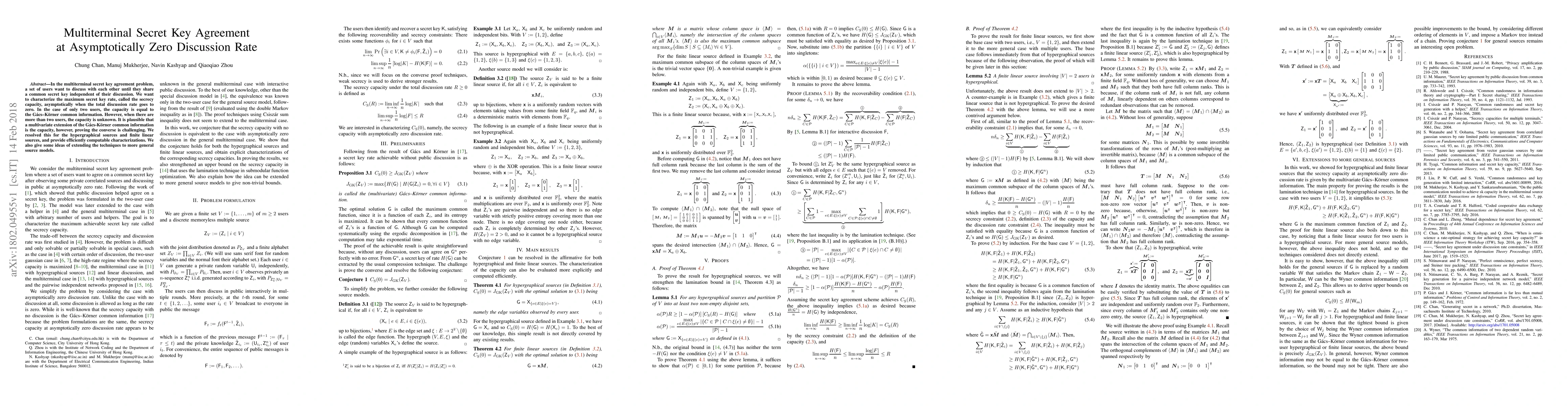 In the multiterminal secret key agreement problem, a set of users want to discuss with each other until they share a common secret key independent of their discussion. We want to characterize the maximum secret key rate, called the secrecy capacity, asymptotically when the total discussion rate goes to zero. In the case of only two users, the capacity is equal to the G\'acs-K\"orner common information. However, when there are more than two users, the capacity is unknown. It is plausible that a multivariate extension of the G\'acs-K\"orner common information is the capacity, however, proving the converse is challenging. We resolved this for the hypergraphical sources and finite linear sources, and provide efficiently computable characterizations. We also give some ideas of extending the techniques to more general source models.