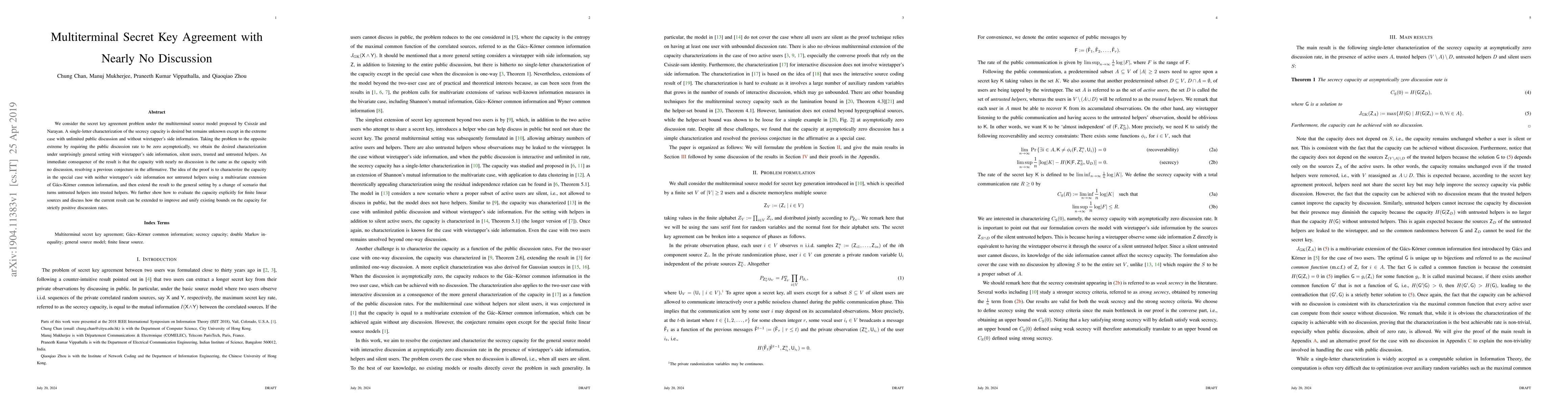 This paper characterizes the secrecy capacity for multiterminal secret key agreement under nearly no public discussion, resolving a conjecture that the capacity with no discussion equals the capacity with nearly no discussion. The proof leverages a multivariate extension of Gács-Körner common information and extends results to settings with wiretappers, silent users, and trusted/untrusted helpers.