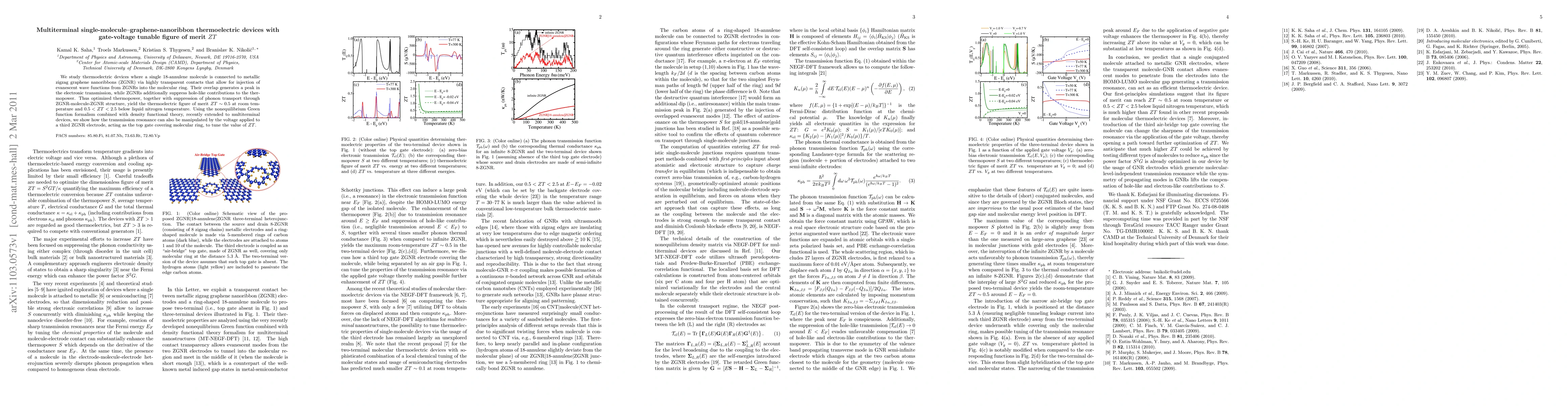 We study thermoelectric devices where a single 18-annulene molecule is connected to metallic zigzag graphene nanoribbons (ZGNR) via highly transparent contacts that allow for injection of evanescent wave functions from ZGNRs into the molecular ring. Their overlap generates a peak in the electronic transmission, while ZGNRs additionally suppress hole-like contributions to the thermopower. Thus optimized thermopower, together with suppression of phonon transport through ZGNR-molecule-ZGNR structure, yield the thermoelectric figure of merit ZT ~ 0.5 at room temperature and 0.5 < ZT < 2.5 below liquid nitrogen temperature. Using the nonequilibrium Green function formalism combined with density functional theory, recently extended to multiterminal devices, we show how the transmission resonance can also be manipulated by the voltage applied to a third ZGNR electrode, acting as the top gate covering molecular ring, to tune the value of ZT.