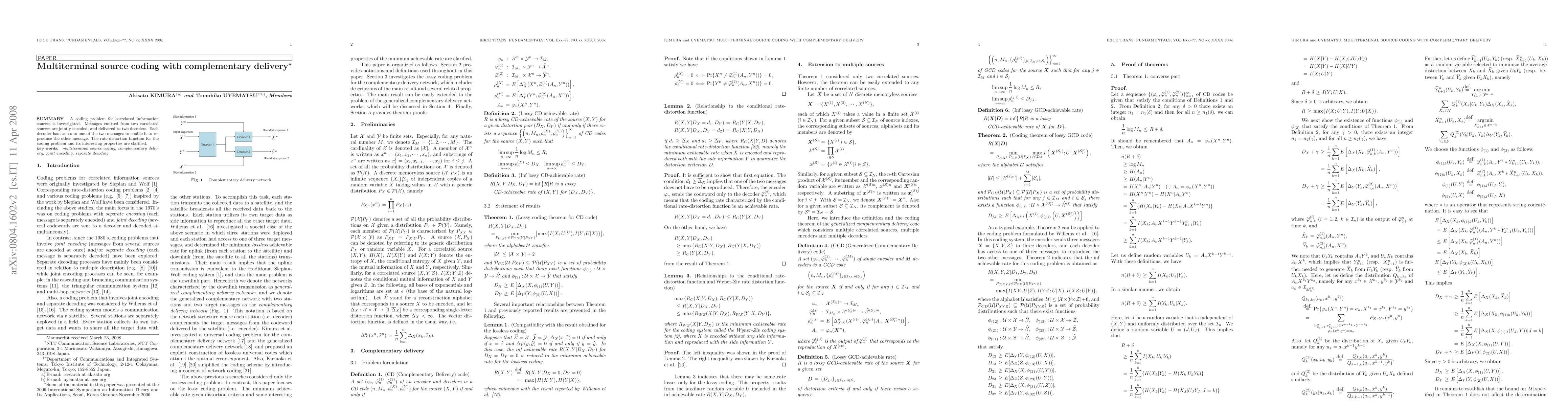 This paper explores multiterminal source coding for two correlated information sources, focusing on joint encoding and complementary delivery to two decoders. It elucidates the rate-distortion function and its properties for optimal message reproduction.