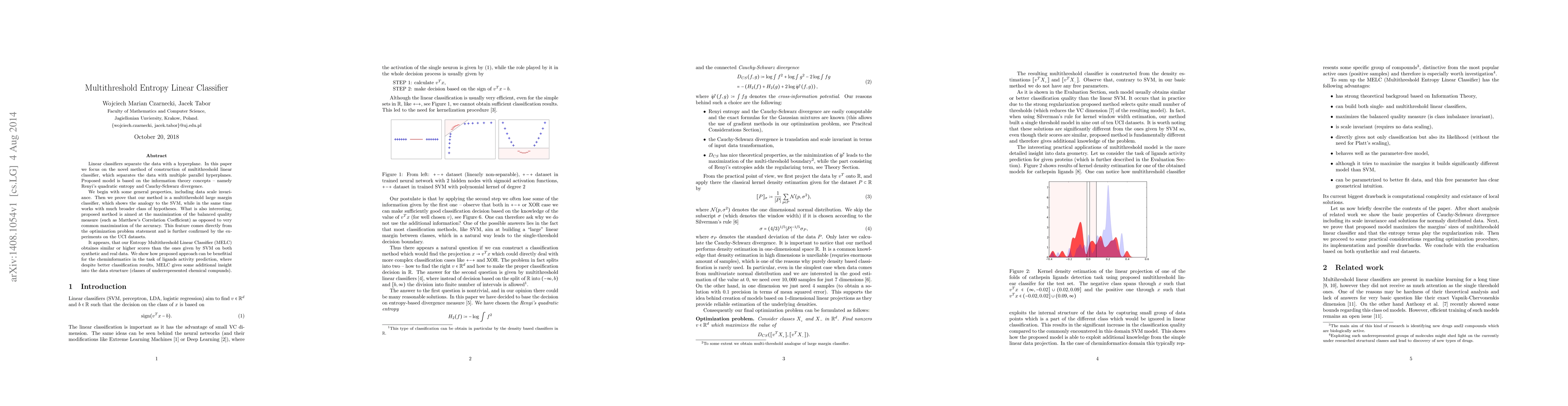 Linear classifiers separate the data with a hyperplane. In this paper we focus on the novel method of construction of multithreshold linear classifier, which separates the data with multiple parallel hyperplanes. Proposed model is based on the information theory concepts -- namely Renyi's quadratic entropy and Cauchy-Schwarz divergence. We begin with some general properties, including data scale invariance. Then we prove that our method is a multithreshold large margin classifier, which shows the analogy to the SVM, while in the same time works with much broader class of hypotheses. What is also interesting, proposed method is aimed at the maximization of the balanced quality measure (such as Matthew's Correlation Coefficient) as opposed to very common maximization of the accuracy. This feature comes directly from the optimization problem statement and is further confirmed by the experiments on the UCI datasets. It appears, that our Multithreshold Entropy Linear Classifier (MELC) obtaines similar or higher scores than the ones given by SVM on both synthetic and real data. We show how proposed approach can be benefitial for the cheminformatics in the task of ligands activity prediction, where despite better classification results, MELC gives some additional insight into the data structure (classes of underrepresented chemical compunds).
