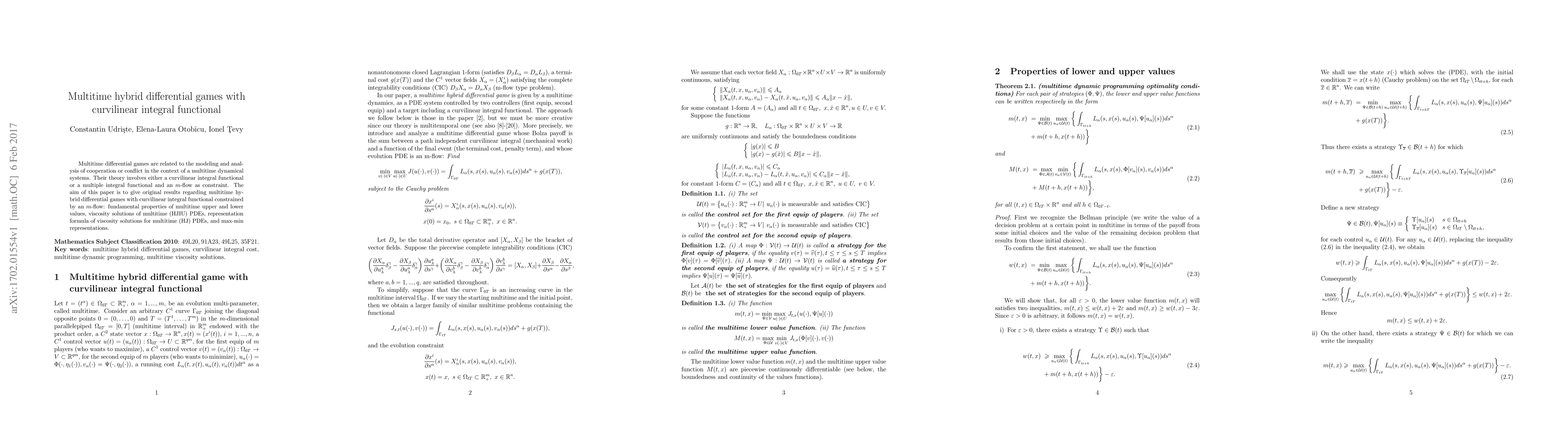 Multitime differential games are related to the modeling and analysis of cooperation or conflict in the context of a multitime dynamical systems. Their theory involves either a curvilinear integral functional or a multiple integral functional and an $m$-flow as constraint. The aim of this paper is to give original results regarding multitime hybrid differential games with curvilinear integral functional constrained by an $m$-flow: fundamental properties of multitime upper and lower values, viscosity solutions of multitime (HJIU) PDEs, representation formula of viscosity solutions for multitime (HJ) PDEs, and max-min representations.