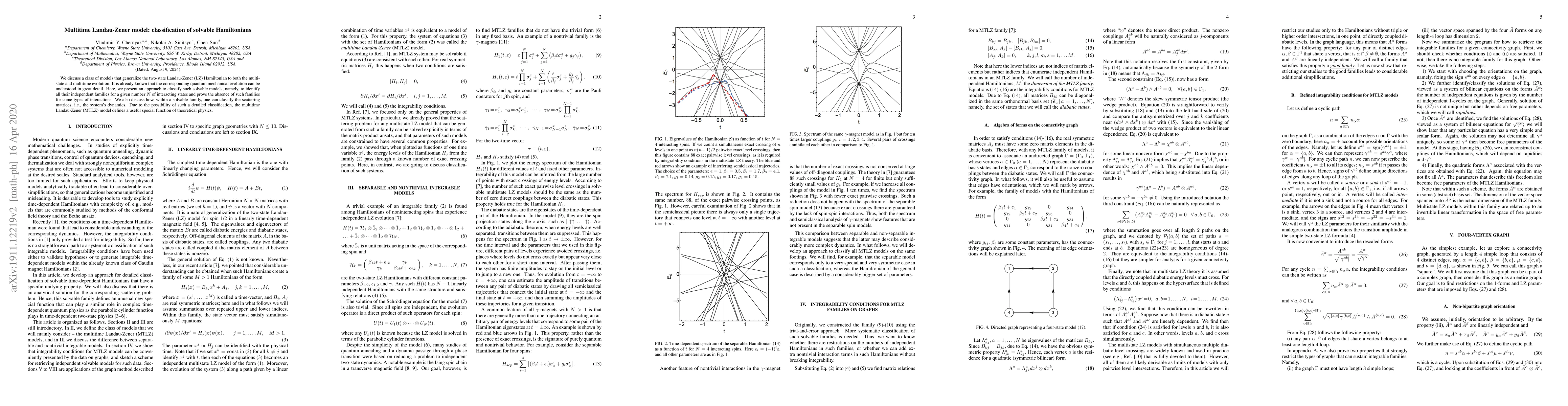 We discuss a class of models that generalize the two-state Landau-Zener (LZ) Hamiltonian to both the multistate and multitime evolution. It is already known that the corresponding quantum mechanical evolution can be understood in great detail. Here, we present an approach to classify such solvable models, namely, to identify all their independent families for a given number $N$ of interacting states and prove the absence of such families for some types of interactions. We also discuss how, within a solvable family, one can classify the scattering matrices, i.e., the system's dynamics. Due to the possibility of such a detailed classification, the multitime Landau-Zener (MTLZ) model defines a useful special function of theoretical physics.