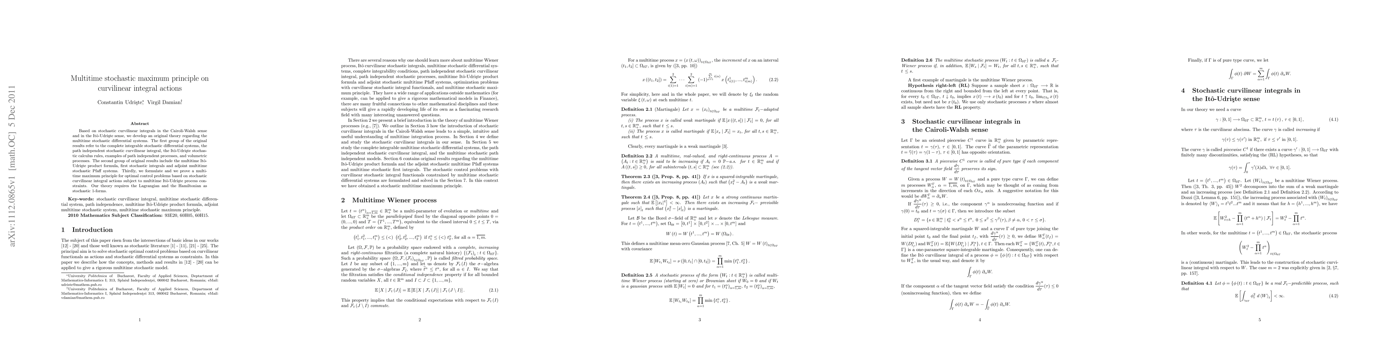Based on stochastic curvilinear integrals in the Cairoli-Walsh sense and in the It\^{o}-Udri\c{s}te sense, we develop an original theory regarding the multitime stochastic differential systems. The first group of the original results refer to the complete integrable stochastic differential systems, the path independent stochastic curvilinear integral, the It\^{o}-Udri\c{s}te stochastic calculus rules, examples of path independent processes, and volumetric processes. The second group of original results include the multitime It\^{o}-Udri\c{s}te product formula, first stochastic integrals and adjoint multitime stochastic Pfaff systems. Thirdly, we formulate and we prove a multitime maximum principle for optimal control problems based on stochastic curvilinear integral actions subject to multitime It\^{o}-Udri\c{s}te process constraints. Our theory requires the Lagrangian and the Hamiltonian as stochastic 1-forms.