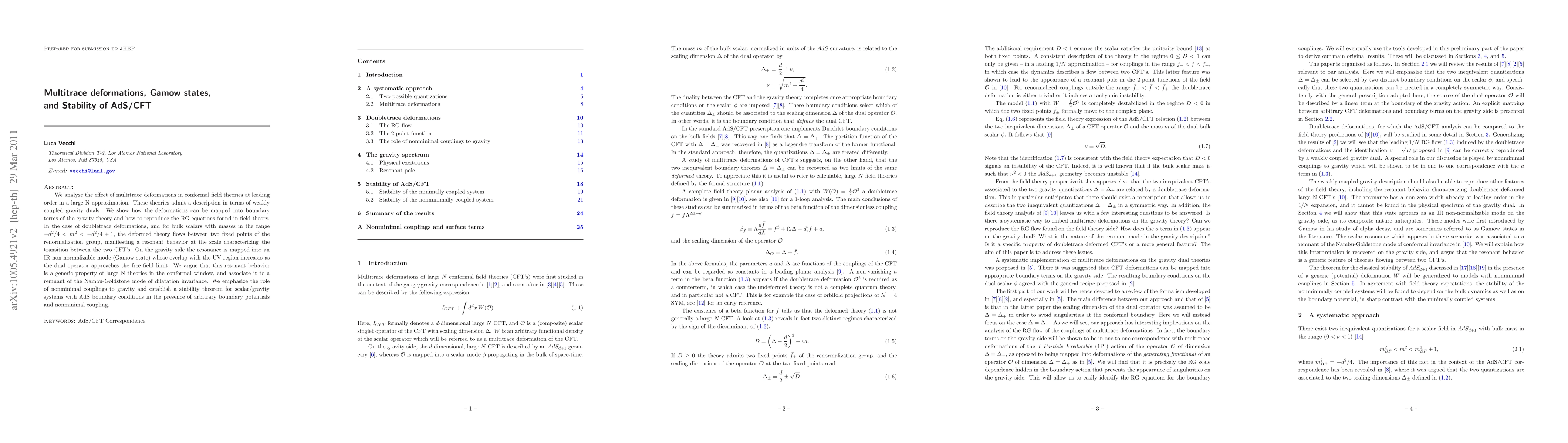 This paper investigates the impact of multitrace deformations in large N conformal field theories, showing their correspondence to boundary terms in the dual weakly coupled gravity theory. It reveals a resonant behavior in the renormalization group flow, associated with a Gamow state in the gravitational description, and establishes a stability theorem for AdS/CFT systems with nonminimal couplings.