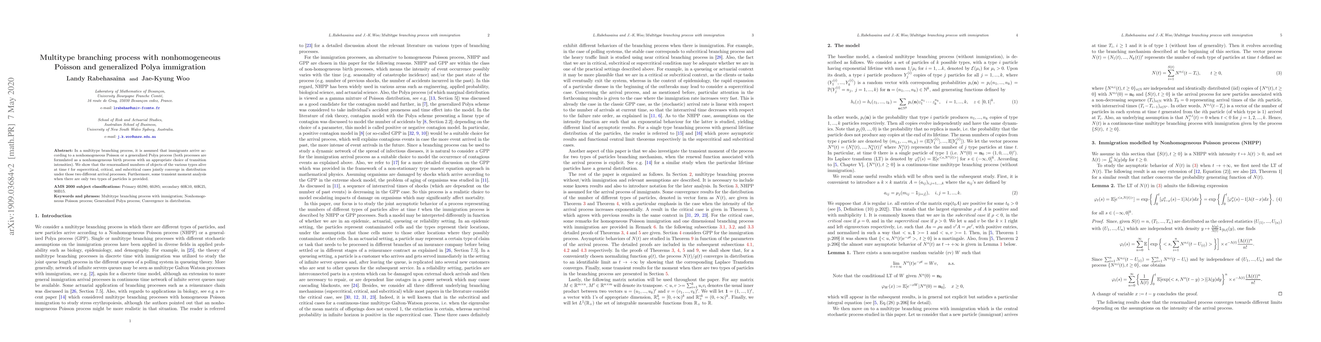 A study on multitype branching processes shows that under certain conditions, the distribution of particles alive at time t converges for different arrival processes, including nonhomogeneous Poisson and generalized Polya.