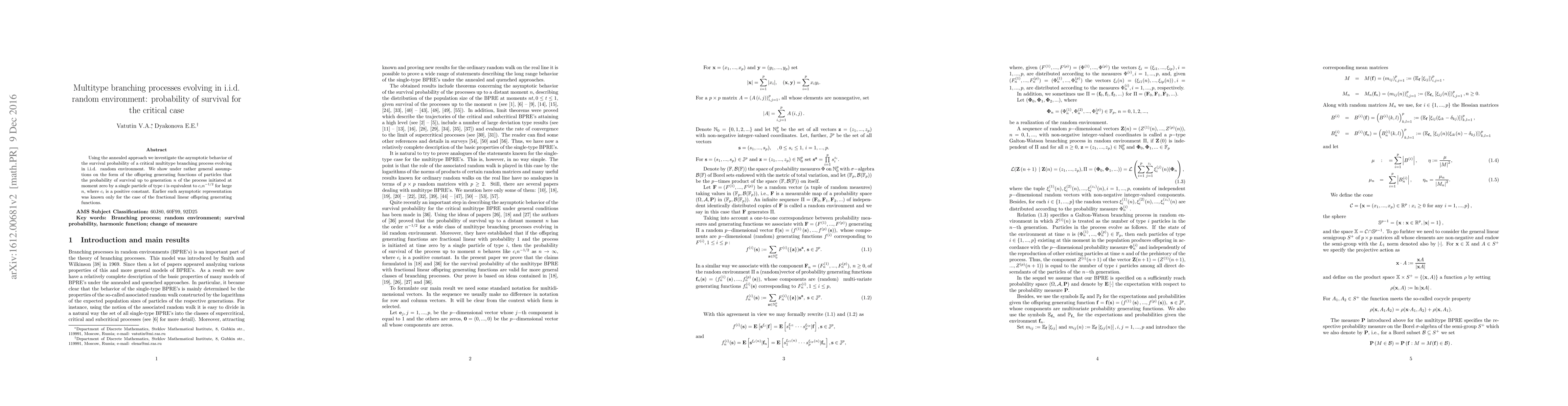 Summary: This paper uses the annealed approach to analyze the survival probability of a critical multitype branching process in a random environment, showing that for large $n$, the survival probability is equivalent to $c_{i}n^{-1/2}$, extending earlier results beyond fractional linear offspring generating functions.