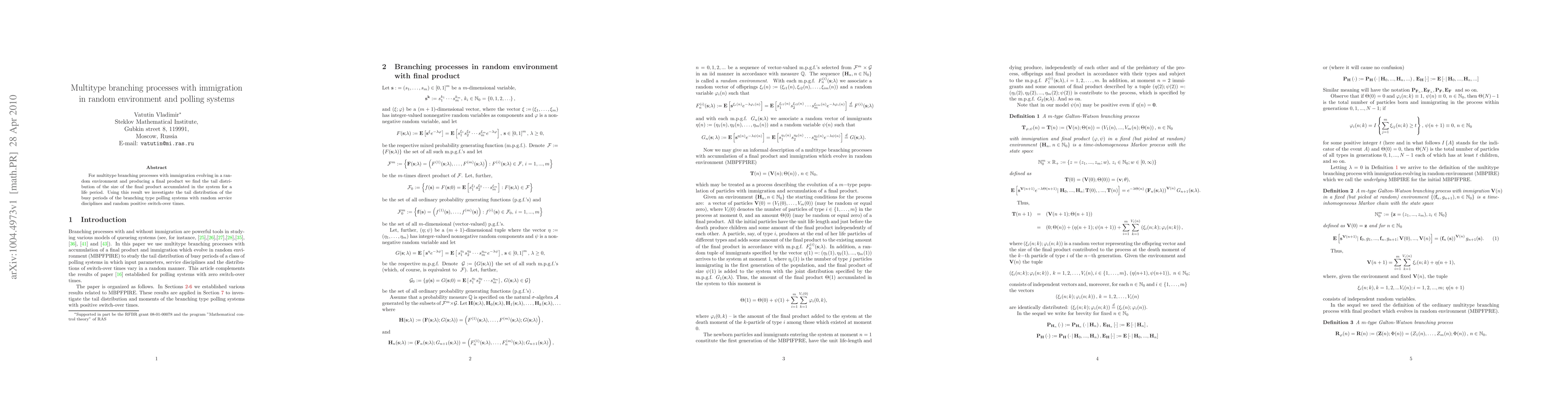 Summary: This paper studies multitype branching processes with immigration in random environments, focusing on the tail distribution of the final product size. It then applies these findings to analyze the tail distribution of busy periods in branching type polling systems with random service disciplines and switch-over times.