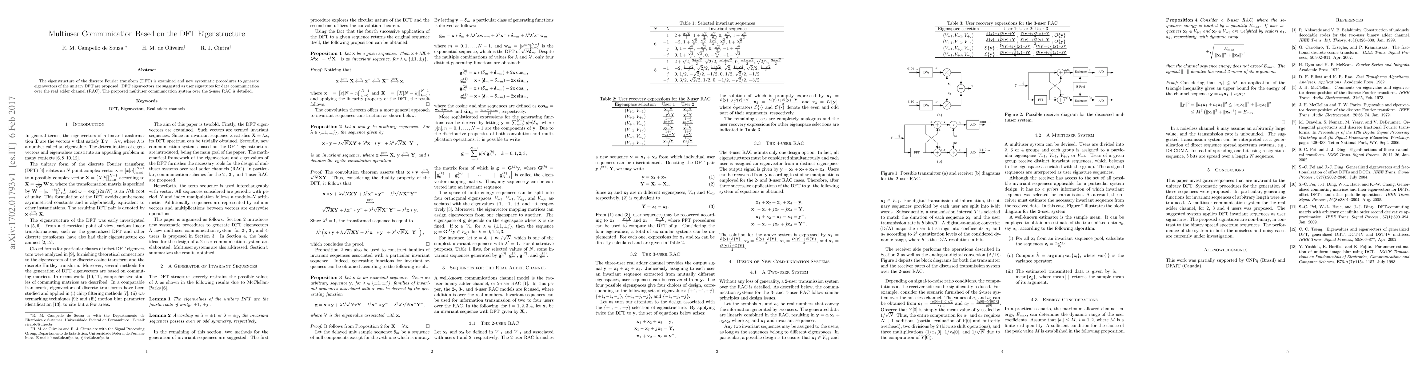 The eigenstructure of the discrete Fourier transform (DFT) is examined and new systematic procedures to generate eigenvectors of the unitary DFT are proposed. DFT eigenvectors are suggested as user signatures for data communication over the real adder channel (RAC). The proposed multiuser communication system over the 2-user RAC is detailed.