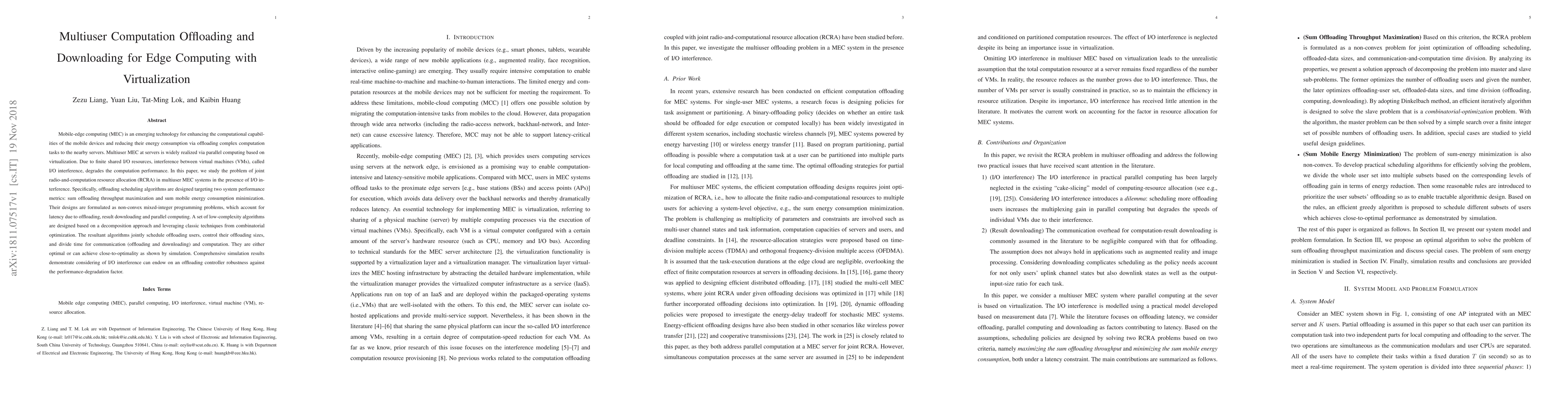 This paper proposes joint radio-and-computation resource allocation algorithms for multiuser mobile-edge computing systems, addressing I/O interference to maximize offloading throughput and minimize energy consumption. The algorithms achieve optimal or near-optimal performance through a decomposition approach and combinatorial optimization techniques.