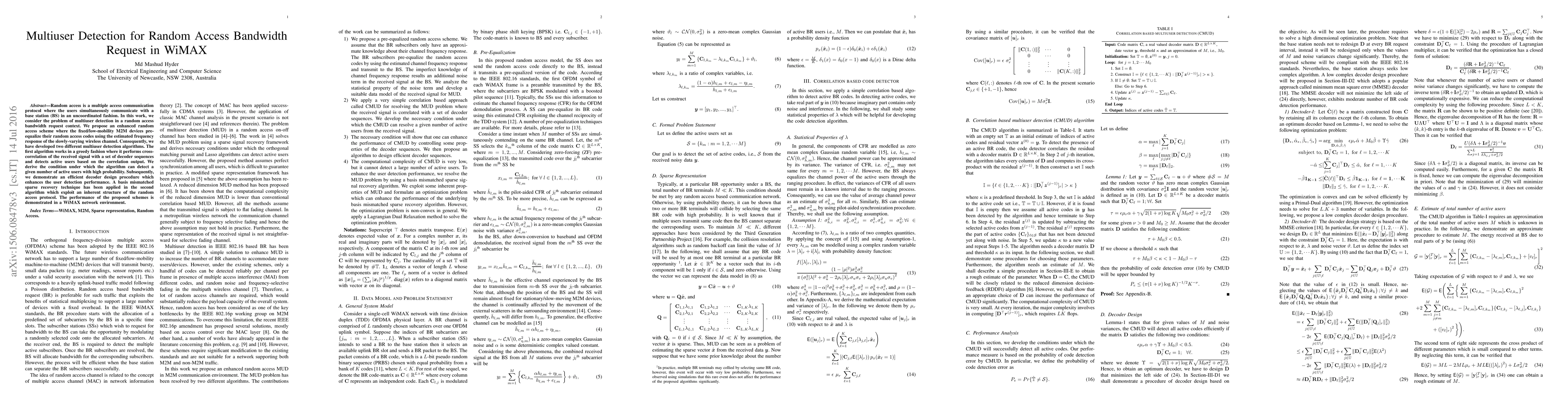 Random access is a multiple access communication protocol where the users simultaneously communicate with a base station (BS) in an uncoordinated fashion. In this work, we consider the problem of multiuser detection in a random access bandwidth request context. We propose an enhanced random access scheme where the fixed/low-mobility M2M devices pre-equalize their random access codes using the estimated frequency response of the slowly-varying wireless channel. Consequently, we have developed two different multiuser detection algorithms. The first algorithm works in a greedy fashion where it performs cross-correlation of the received signal with a set of decoder sequences and detects active users based on the correlation output. We derive the condition under which the algorithm can detect a given number of active users with high probability. Subsequently, we demonstrate an efficient decoder design procedure which enhances the user detection performance. A basis mismatched sparse recovery technique has been applied in the second algorithm which exploit an inherent structure of the random access protocol. The performance of the proposed schemes is demonstrated in a WiMAX network environment.