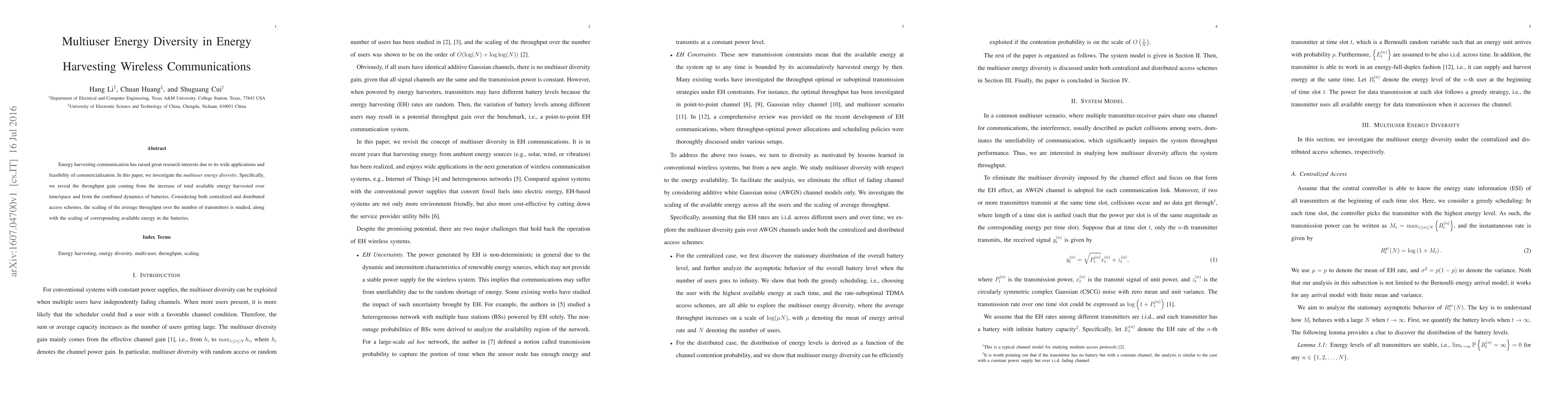 Energy harvesting communication has raised great research interests due to its wide applications and feasibility of commercialization. In this paper, we investigate the multiuser energy diversity. Specifically, we reveal the throughput gain coming from the increase of total available energy harvested over time/space and from the combined dynamics of batteries. Considering both centralized and distributed access schemes, the scaling of the average throughput over the number of transmitters is studied, along with the scaling of corresponding available energy in the batteries.
