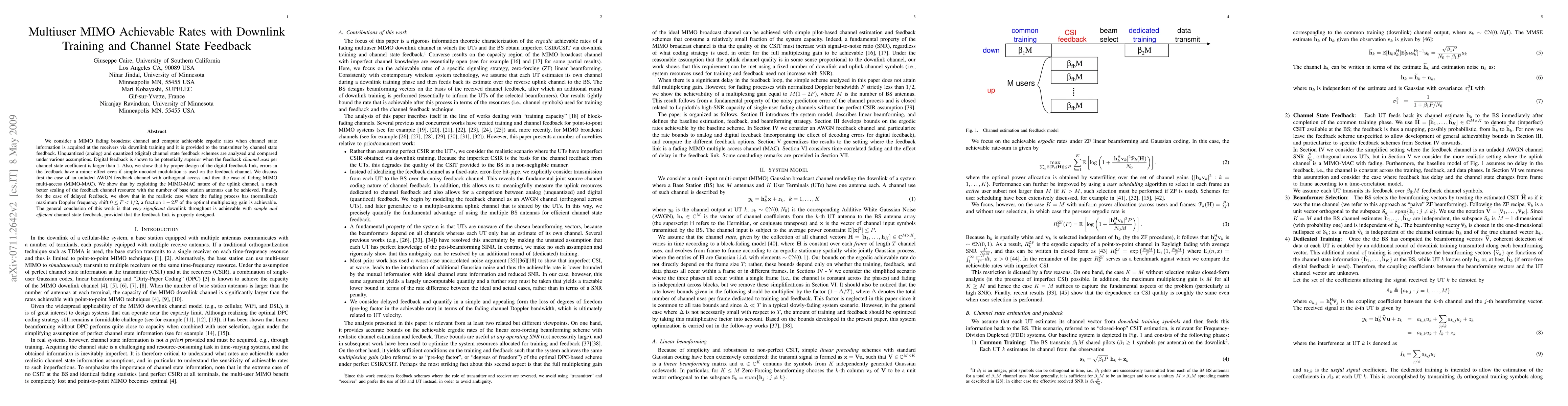 This paper investigates achievable rates in a multiuser MIMO system with downlink training and channel state feedback, comparing unquantized and quantized feedback schemes. It finds that digital feedback can be superior under certain conditions and that proper design can mitigate feedback errors, leading to significant downlink throughput gains.