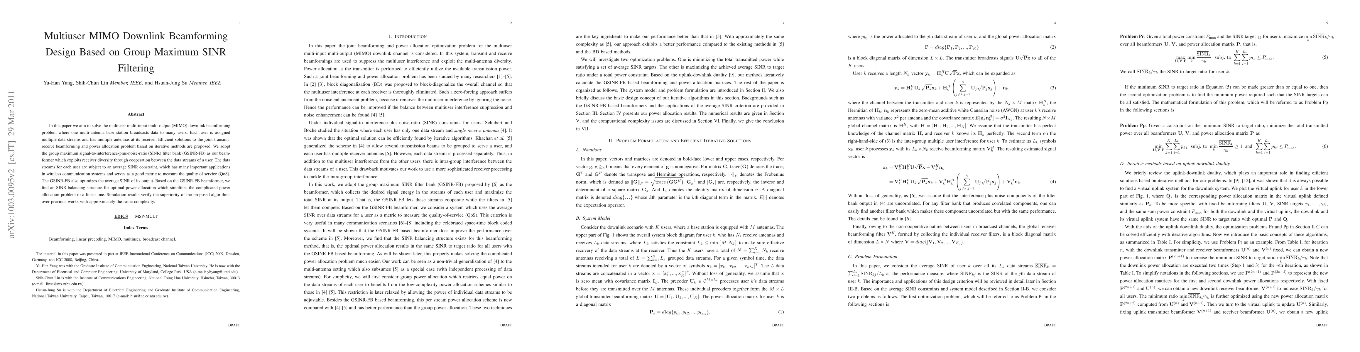 This paper proposes efficient beamforming solutions for multiuser MIMO downlink systems using an iterative method based on the group maximum SINR filter bank (GSINR-FB). The GSINR-FB optimizes the average SINR for data streams, simplifying power allocation to a linear problem, and demonstrates superior performance compared to previous methods.
