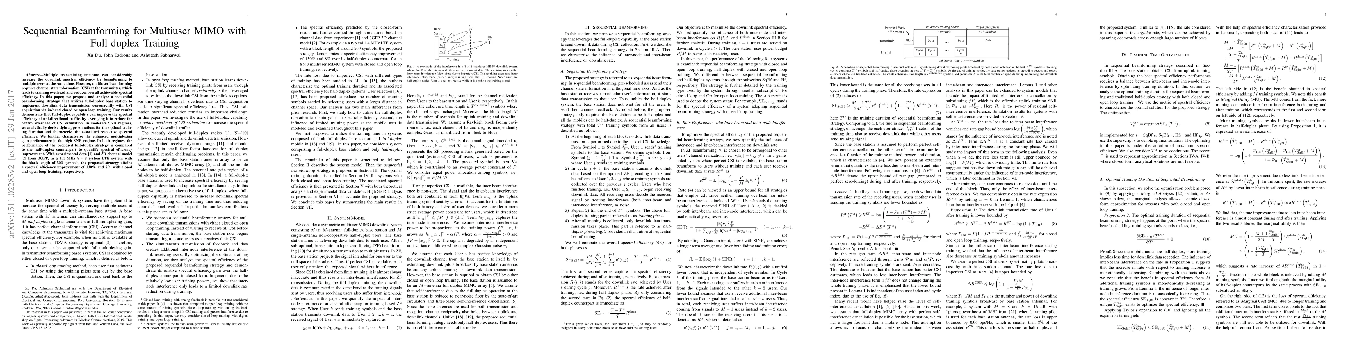 This paper proposes a multiuser MIMO sequential beamforming strategy using a full-duplex base station to concurrently transmit data and acquire channel state information (CSI) via in-band training, achieving significant spectral efficiency improvements over half-duplex methods. Experimental results show a 130% and 8% spectral efficiency gain with closed and open loop training, respectively.