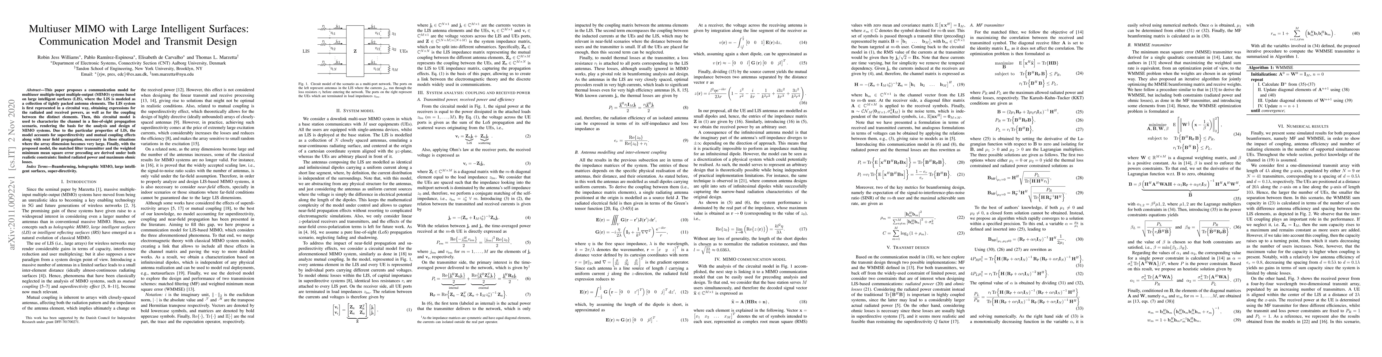 This paper proposes a communication model for multiuser multiple-input multiple-output (MIMO) systems based on large intelligent surfaces (LIS), where the LIS is modeled as a collection of tightly packed antenna elements. The LIS system is first represented in a circuital way, obtaining expressions for the radiated and received powers, as well as for the coupling between the distinct elements. Then, this circuital model is used to characterize the channel in a line-of-sight propagation scenario, rendering the basis for the analysis and design of MIMO systems. Due to the particular properties of LIS, the model accounts for superdirectivity and mutual coupling effects along with near field propagation, necessary in those situations where the array dimension becomes very large. Finally, with the proposed model, the matched filter transmitter and the weighted minimum mean square error precoding are derived under both realistic constraints: limited radiated power and maximum ohmic losses.