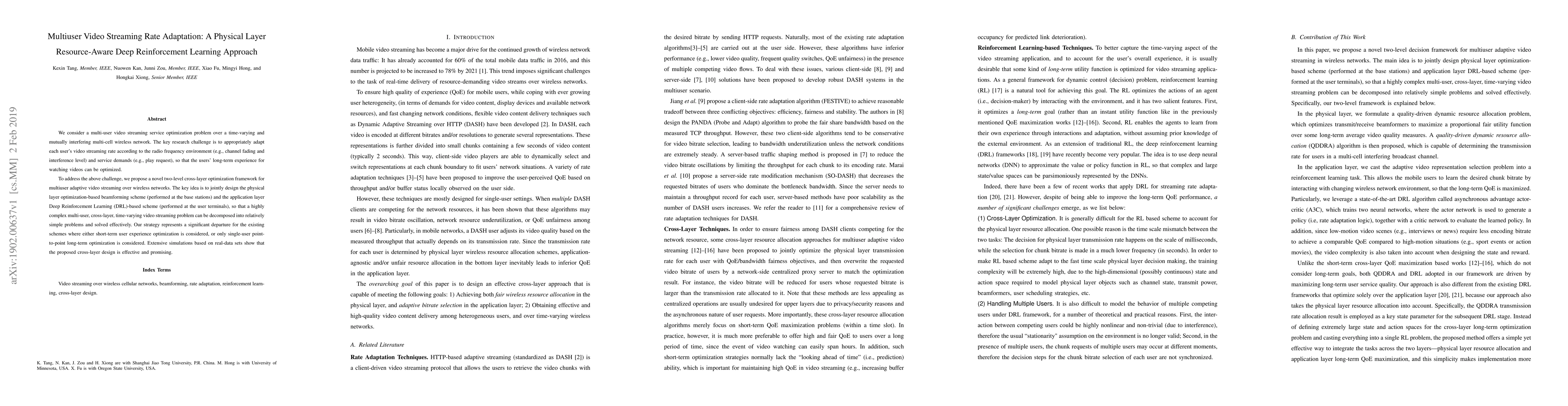 This paper proposes a novel deep reinforcement learning approach for optimizing multiuser video streaming rates in a time-varying wireless network. It combines physical layer beamforming with application layer DRL to adapt video streaming rates based on the radio environment and service demands, significantly improving long-term user experience.