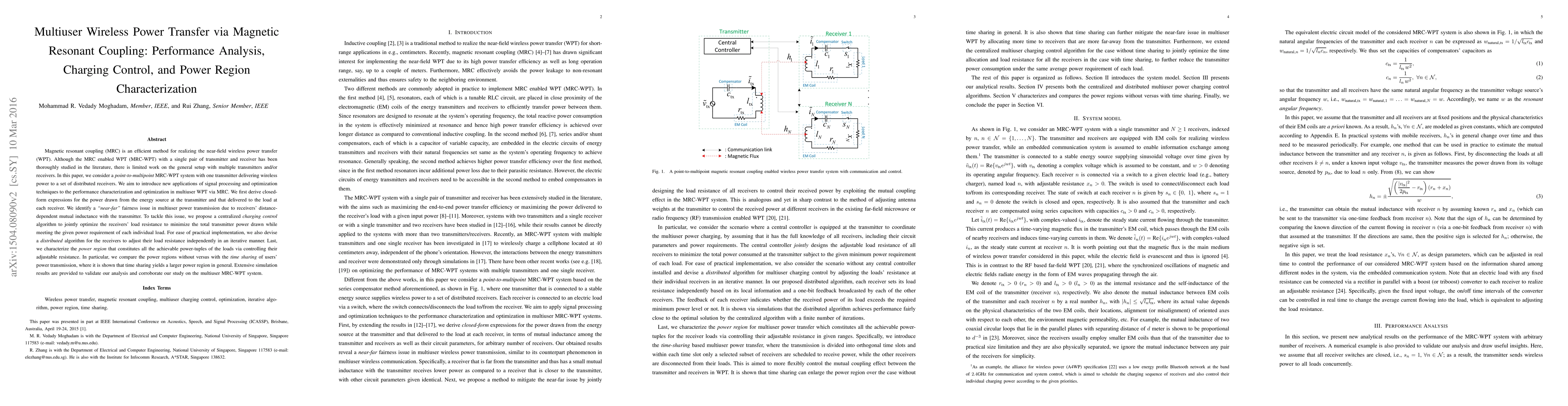 This paper investigates multiuser wireless power transfer using magnetic resonant coupling (MRC), focusing on performance analysis, charging control, and power region characterization. It proposes centralized and distributed algorithms to optimize power delivery to multiple receivers, addressing the "near-far" fairness issue and comparing power regions with and without time sharing of users.