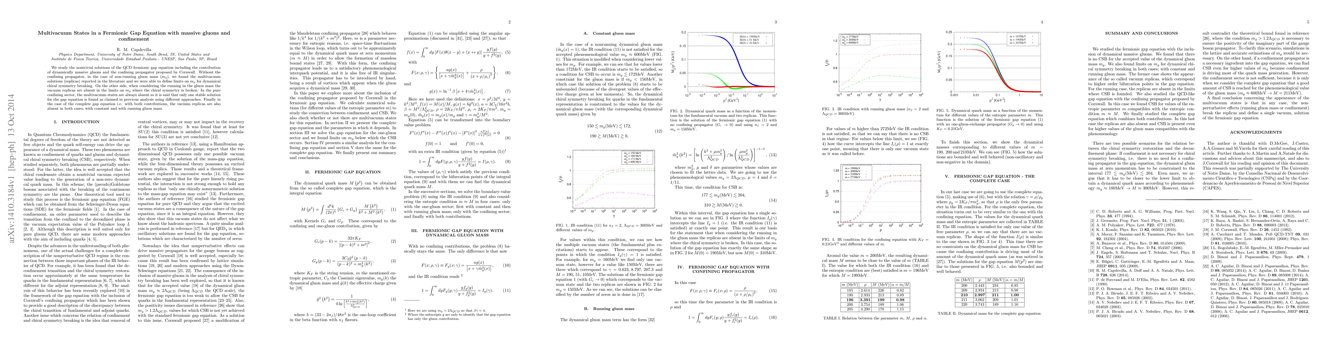 This paper investigates the QCD fermionic gap equation with massive gluons and confinement, finding that multivacuum solutions (replicas) appear without the confining propagator for non-running gluon mass, but vanish with running gluon mass or in the pure confining sector. Thus, only one stable solution is found in the complete gap equation scenario.
