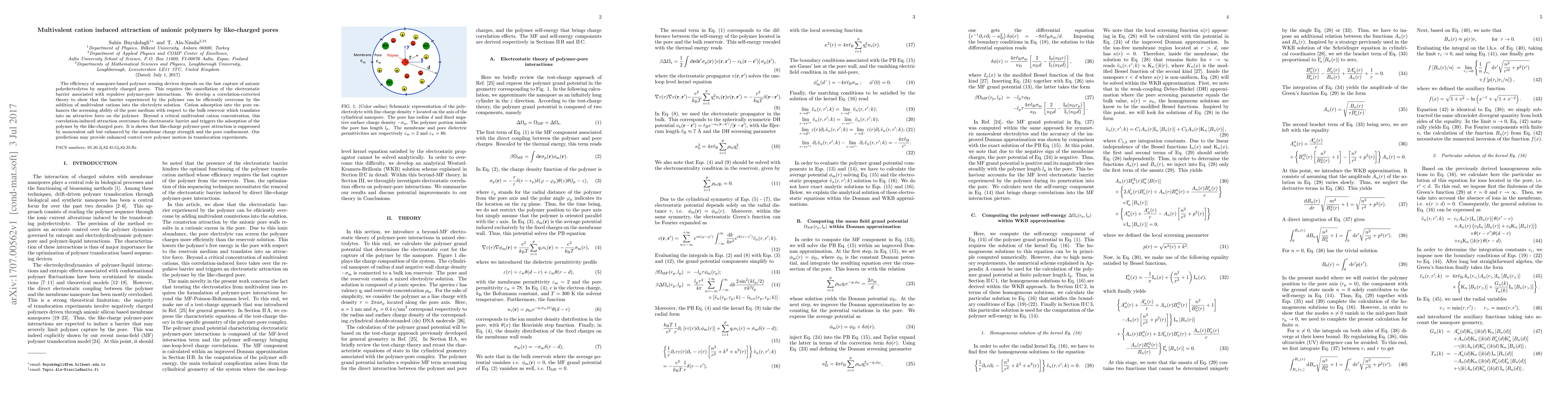This paper develops a theory showing how multivalent cations can overcome the electrostatic barrier for the capture of anionic polymers by negatively charged pores, enhancing polymer adsorption through cation-induced attraction. The study highlights the role of cation concentration, membrane charge, and pore confinement in this process.
