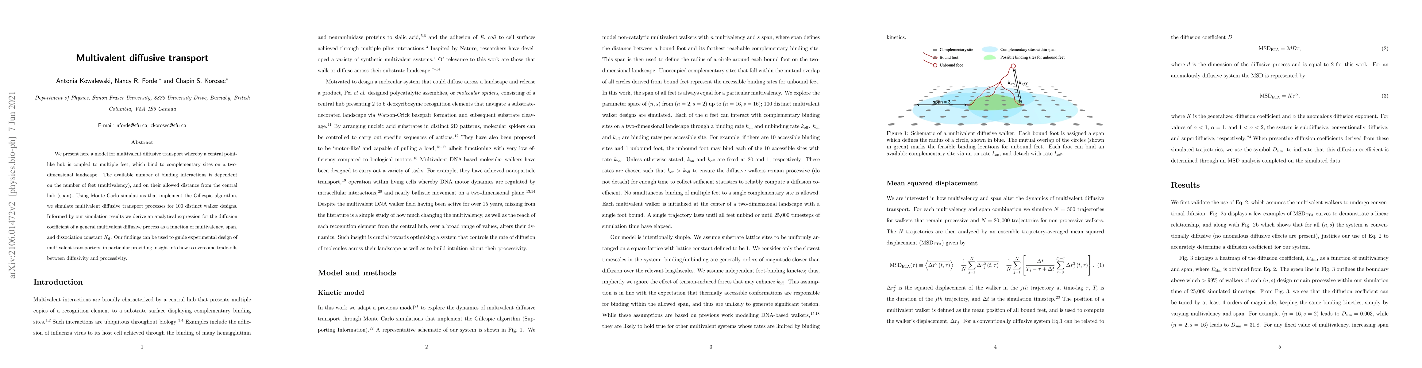 We present here a model for multivalent diffusive transport whereby a central point-like hub is coupled to multiple feet, which bind to complementary sites on a two-dimensional landscape. The available number of binding interactions is dependent on the number of feet (multivalency), and on their allowed distance from the central hub (span). Using Monte Carlo simulations that implement the Gillespie algorithm, we simulate multivalent diffusive transport processes for 100 distinct walker designs. Informed by our simulation results we derive an analytical expression for the diffusion coefficient of a general multivalent diffusive process as a function of multivalency, span, and dissociation constant Kd. Our findings can be used to guide experimental design of multivalent transporters, in particular providing insight into how to overcome trade-offs between diffusivity and processivity.