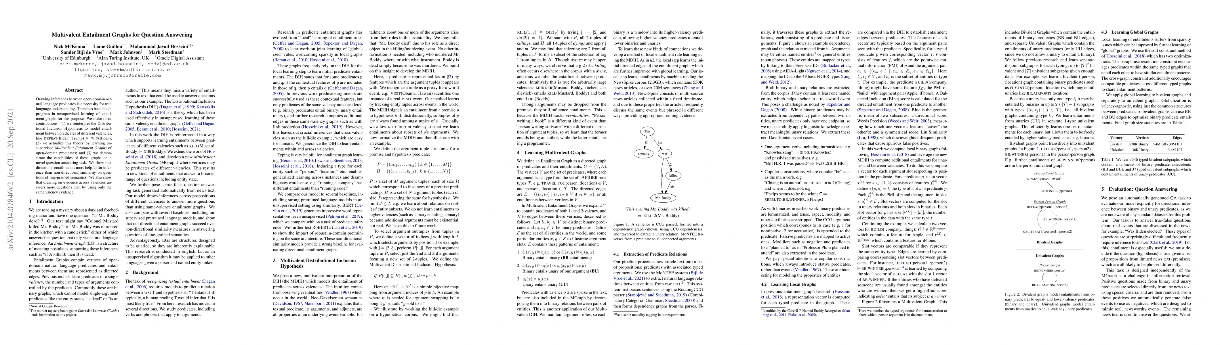 This paper proposes the use of Multivalent Entailment Graphs to model entailment between predicates of different valencies, demonstrating their effectiveness in a question answering task. The authors show that directional entailment is superior for fine-grained semantic inference compared to bidirectional similarity.
