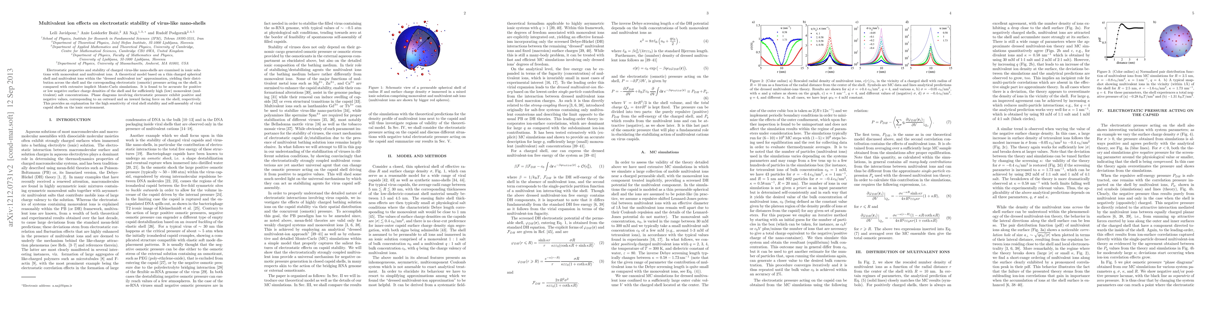 This paper investigates the electrostatic stability of virus-like nano-shells in ionic solutions, comparing theoretical models with Monte-Carlo simulations. It finds that multivalent ions significantly affect the electrostatic pressure, explaining the high sensitivity of viral shell stability to the ionic environment.