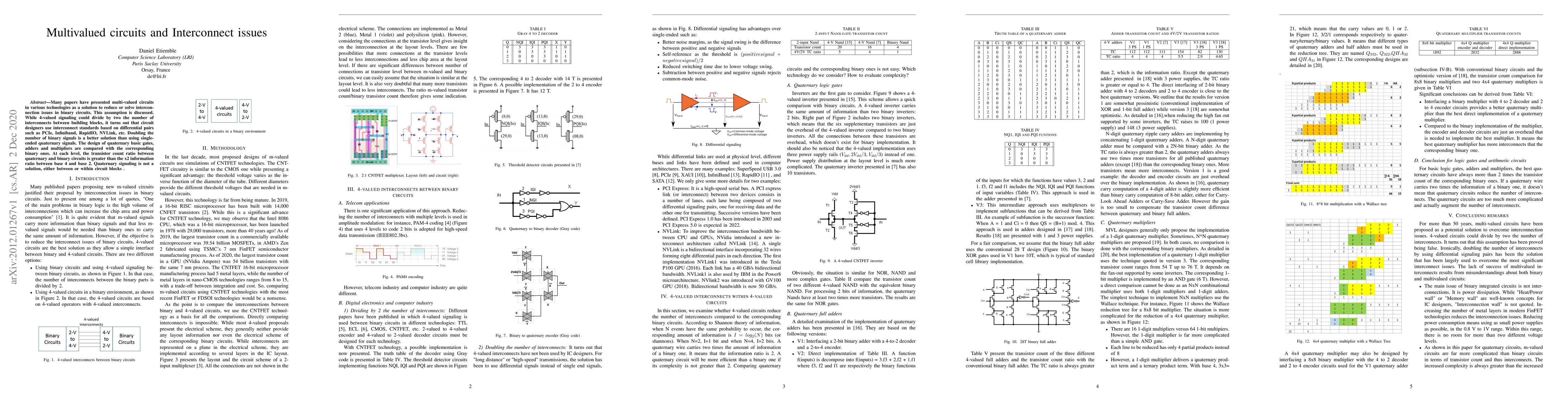 Many papers have presented multi-valued circuits in various technologies as a solution to reduce or solve interconnection issues in binary circuits. This assumption is discussed. While 4-valued signaling could divide by two the number of interconnects between building blocks, it turns out that circuit designers use interconnect standards based on differential pairs such as PCIe, Infiniband, RapidIO, NVLink, etc. Doubling the number of binary signals is a better solution than using single-ended quaternary signals. The design of quaternary basic gates, adders and multipliers are compared with the corresponding binary ones. At each level, the transistor count ratio between quaternary and binary circuits is greater than the x2 information ratio between base 4 and base 2. Quaternary signaling is not a solution, either between or within circuit blocks .