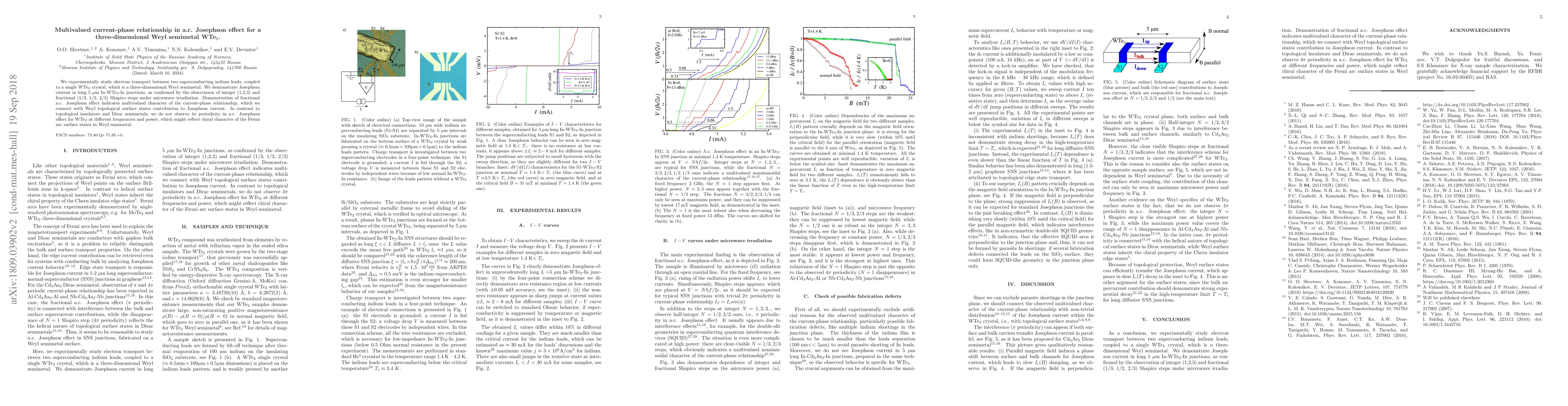 We experimentally study electron transport between two superconducting indium leads, coupled to a single WTe$_2$ crystal, which is a three-dimensional Weyl semimetal. We demonstrate Josephson current in long 5~$\mu$m In-WTe$_2$-In junctions, as confirmed by the observation of integer (1,2,3) and fractional (1/3, 1/2, 2/3) Shapiro steps under microwave irradiation. Demonstration of fractional a.c. Josephson effect indicates multivalued character of the current-phase relationship, which we connect with Weyl topological surface states contribution to Josephson current. In contrast to topological insulators and Dirac semimetals, we do not observe $4\pi$ periodicity in a.c. Josephson effect for WTe$_2$ at different frequencies and power, which might reflect chiral character of the Fermi arc surface states in Weyl semimetal.
