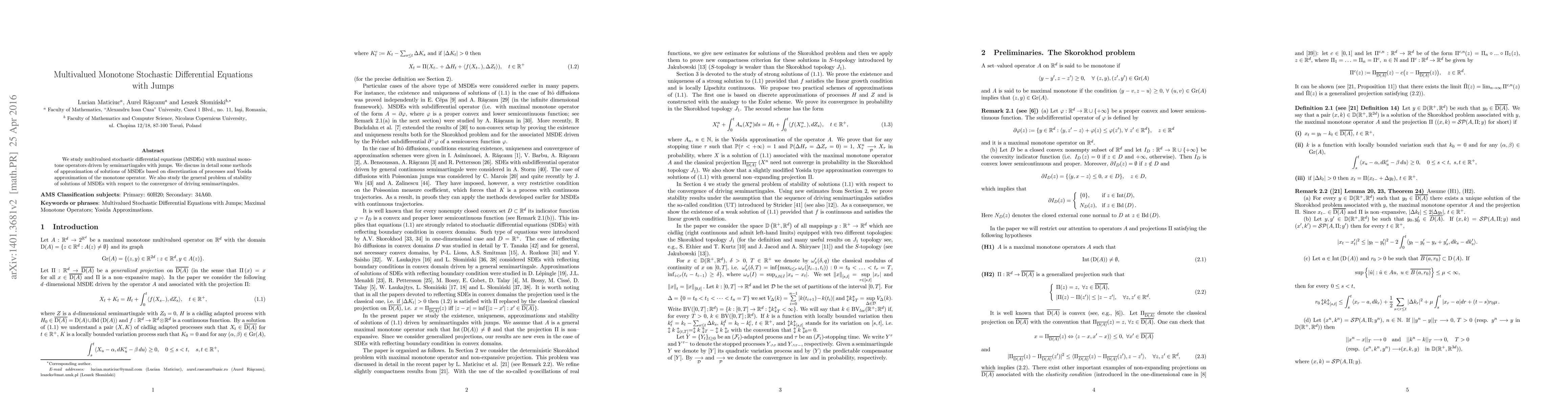 This paper investigates multivalued monotone stochastic differential equations with jumps, focusing on approximation methods and stability issues. It employs discretization techniques and Yosida approximations to solve these complex equations and examines the stability of solutions under driving semimartingale convergence.