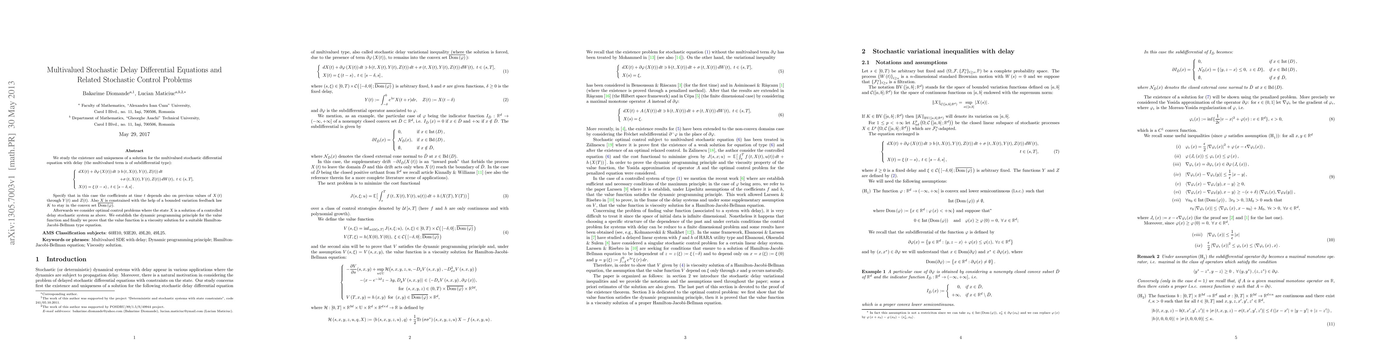 We study the existence and uniqueness of a solution for the multivalued stochastic differential equation with delay (the multivalued term is of subdifferential type): \[ \left\{\begin{array} [c]{r} dX(t)+\partial\varphi\left(X(t)\right) dt\ni b\left(t,X(t),Y(t),Z(t)\right) dt+\sigma\left(t,X(t),Y(t),Z(t)\right)dW(t), \medskip\\ t\in(s,T],\medskip\\ \multicolumn{1}{l}{X(t)=\xi\left(t-s\right) ,\;t\in\left[ s-\delta,s\right] .} \end{array} \right. \] Specify that in this case the coefficients at time $t$ depends also on previous values of $X\left(t\right) $ through $Y(t)$ and $Z(t)$. Also $X$ is constrained with the help of a bounded variation feedback law $K$ to stay in the convex set $\bar{\mathrm{Dom}\left(\varphi\right)}$. Afterwards we consider optimal control problems where the state $X$ is a solution of a controlled delay stochastic system as above. We establish the dynamic programming principle for the value function and finally we prove that the value function is a viscosity solution for a suitable Hamilton-Jacobi-Bellman type equation.