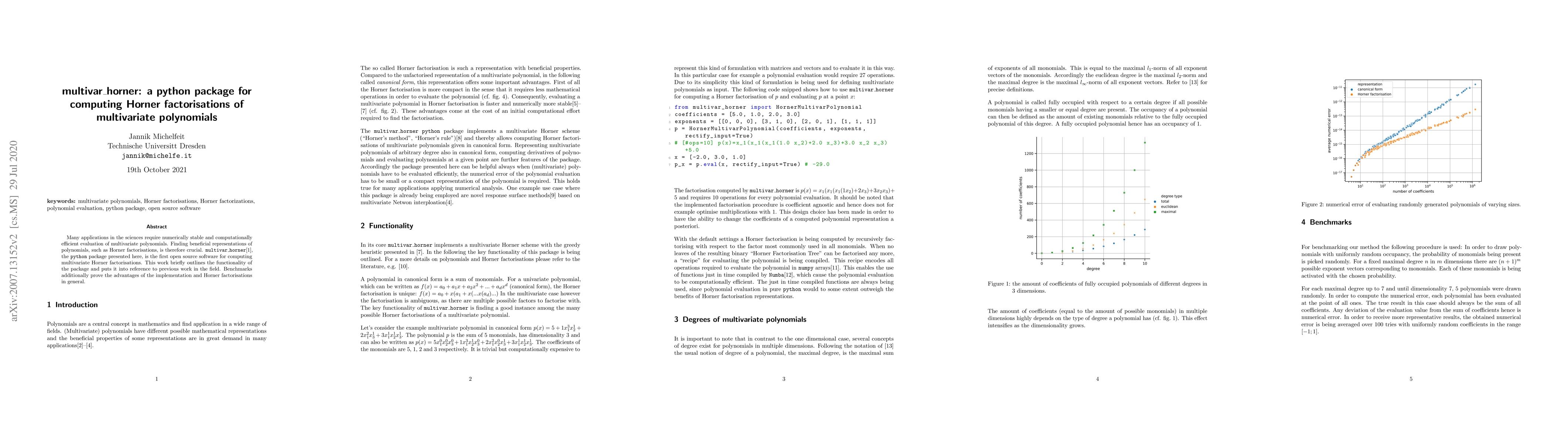 The multivar_horner Python package computes Horner factorisations of multivariate polynomials, offering a numerically stable and efficient method for polynomial evaluation. Benchmarks demonstrate its advantages over previous methods.