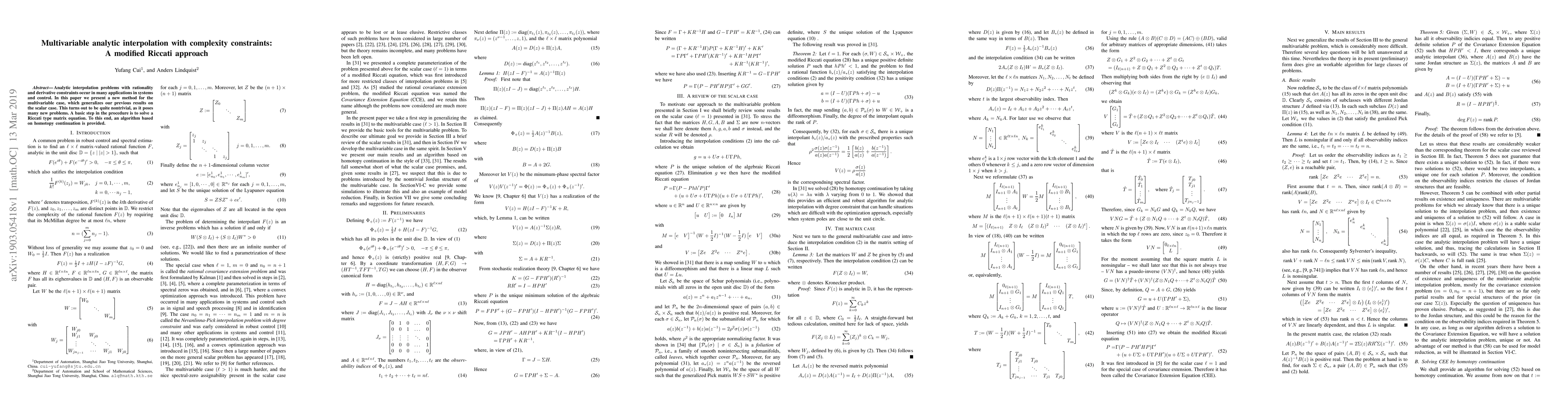 Analytic interpolation problems with rationality and derivative constraints occur in many applications in systems and control. In this paper we present a new method for the multivariable case, which generalizes our previous results on the scalar case. This turns out to be quite nontrivial, as it poses many new problems. A basic step in the procedure is to solve a Riccati type matrix equation. To this end, an algorithm based on homotopy continuation is provided.