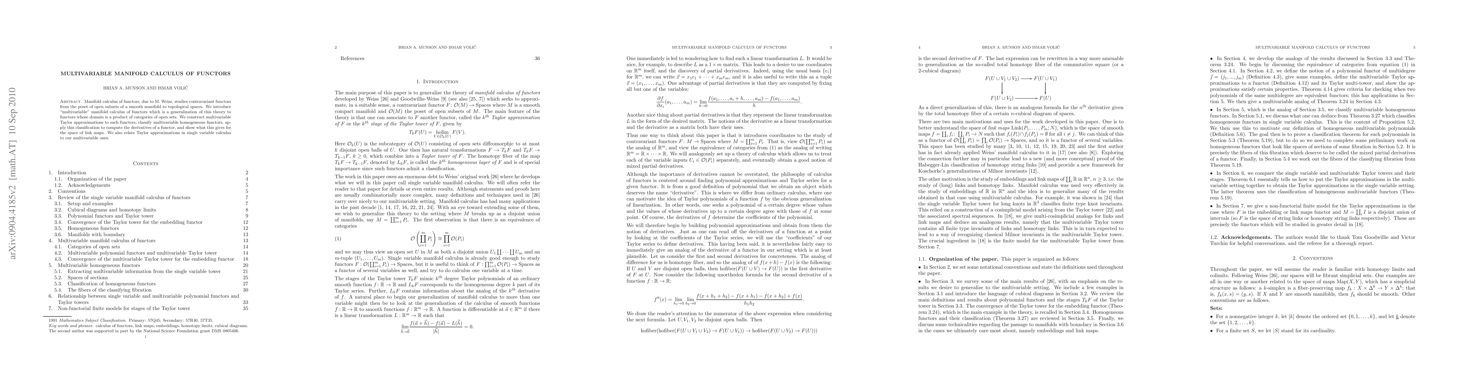 This paper generalizes manifold calculus of functors to multivariable settings, constructing Taylor approximations and classifying homogeneous functors. It applies this framework to compute derivatives and explores connections to single-variable calculus.