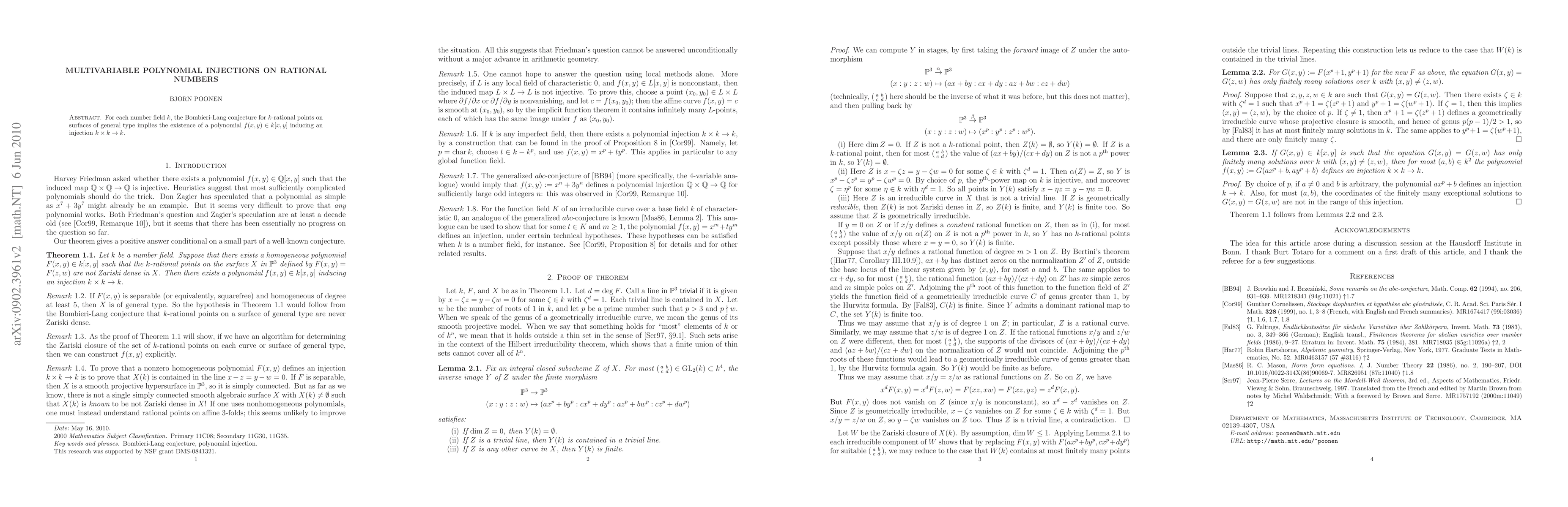 For each number field k, the Bombieri-Lang conjecture for k-rational points on surfaces of general type implies the existence of a polynomial f(x,y) in k[x,y] inducing an injection k x k --> k.