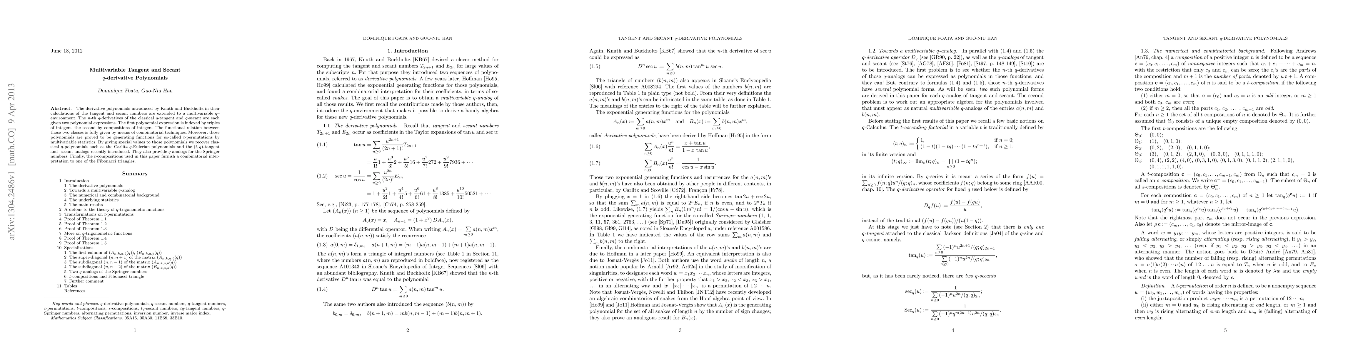 The derivative polynomials introduced by Knuth and Buckholtz in their calculations of the tangent and secant numbers are extended to a multivariable $q$--environment. The $n$-th $q$-derivatives of the classical $q$-tangent and $q$-secant are each given two polynomial expressions. The first polynomial expression is indexed by triples of integers, the second by compositions of integers. The functional relation between those two classes is fully given by means of combinatorial techniques. Moreover, those polynomials are proved to be generating functions for so-called $t$-permutations by multivariable statistics. By giving special values to those polynomials we recover classical $q$-polynomials such as the Carlitz $q$-Eulerian polynomials and the $(t,q)$-tangent and -secant analogs recently introduced. They also provide $q$-analogs for the Springer numbers. Finally, the $t$-compositions used in this paper furnish a combinatorial interpretation to one of the Fibonacci triangles.