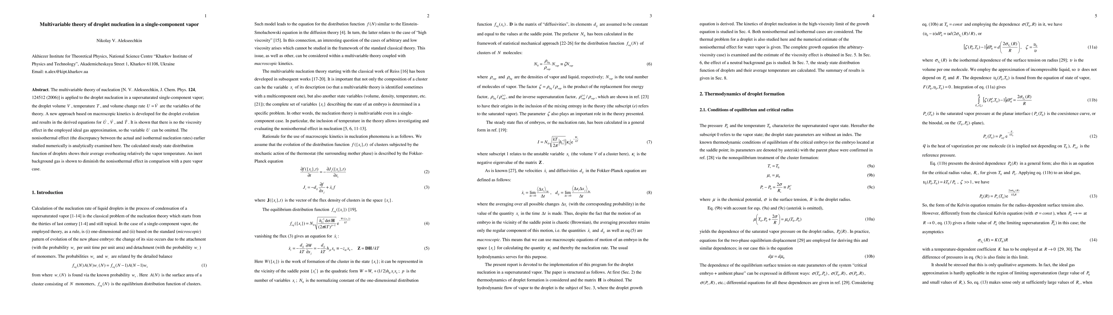 This paper applies a multivariable theory to droplet nucleation in a supersaturated single-component vapor, deriving equations for the evolution of droplet volume, temperature, and volume change rate. It finds no viscosity effect in the ideal gas approximation and analytically examines the nonisothermal effect, showing that an inert background gas reduces this effect.