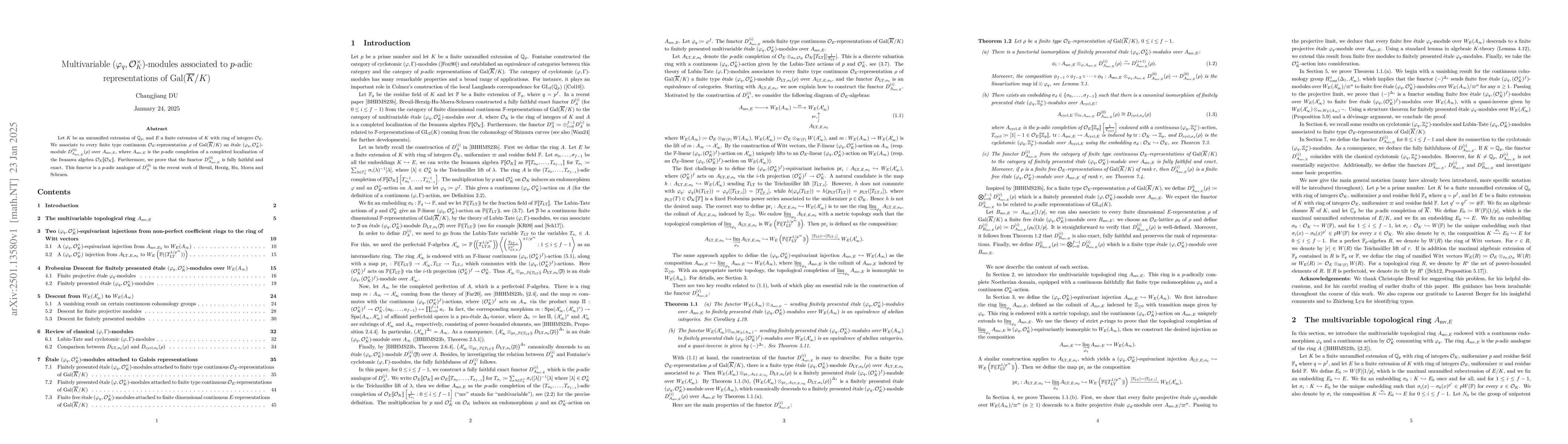 This paper associates multivariable $(\varphi_q,\mathcal{O}_K^{\times})$-modules to finite type continuous $\mathcal{O}_E$-representations of $\mathrm{Gal}(\overline{K}/K)$, constructing a $p$-adic analogue of a functor introduced by Breuil et al. The authors prove the functor $D_{A_{\mathrm{mv},E}}^{(0)}$ is fully faithful and exact.