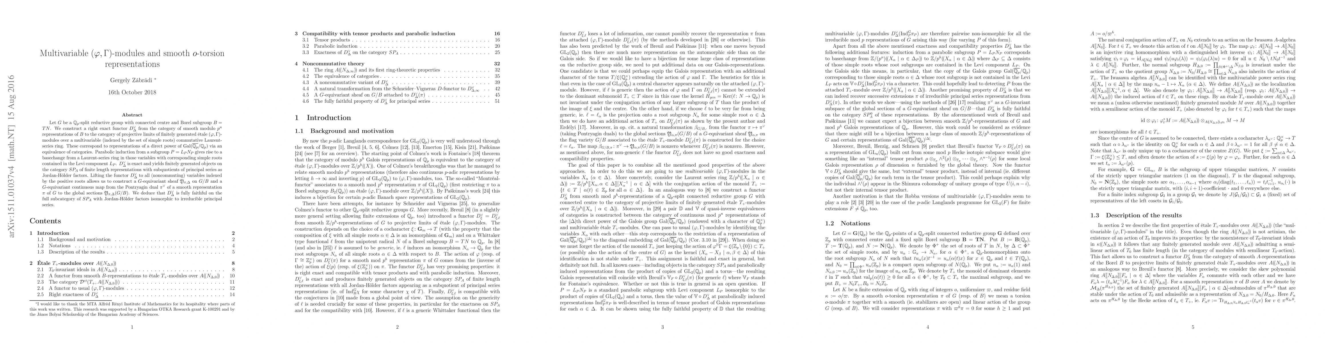Let $G$ be a $\mathbb{Q}_p$-split reductive group with connected centre and Borel subgroup $B=TN$. We construct a right exact functor $D^\vee_\Delta$ from the category of smooth modulo $p^n$ representations of $B$ to the category of projective limits of finitely generated \'etale $(\varphi,\Gamma)$-modules over a multivariable (indexed by the set of simple roots) commutative Laurent-series ring. These correspond to representations of a direct power of $\mathrm{Gal}(\overline{\mathbb{Q}_p}/\mathbb{Q}_p)$ via an equivalence of categories. Parabolic induction from a subgroup $P=L_PN_P$ corresponds to a basechange from a Laurent-series ring in those variables with corresponding simple roots contained in the Levi component $L_P$. $D^\vee_\Delta$ is exact and yields finitely generated objects on the category $SP_A$ of finite length representations with subquotients of principal series as Jordan-H\"older factors. Lifting the functor $D^\vee_\Delta$ to all (noncommuting) variables indexed by the positive roots allows us to construct a $G$-equivariant sheaf $\mathfrak{Y}_{\pi,\Delta}$ on $G/B$ and a $G$-equivariant continuous map from the Pontryagin dual $\pi^\vee$ of a smooth representation $\pi$ of $G$ to the global sections $\mathfrak{Y}_{\pi,\Delta}(G/B)$. We deduce that $D^\vee_\Delta$ is fully faithful on the full subcategory of $SP_A$ with Jordan-H\"older factors isomorphic to irreducible principal series.