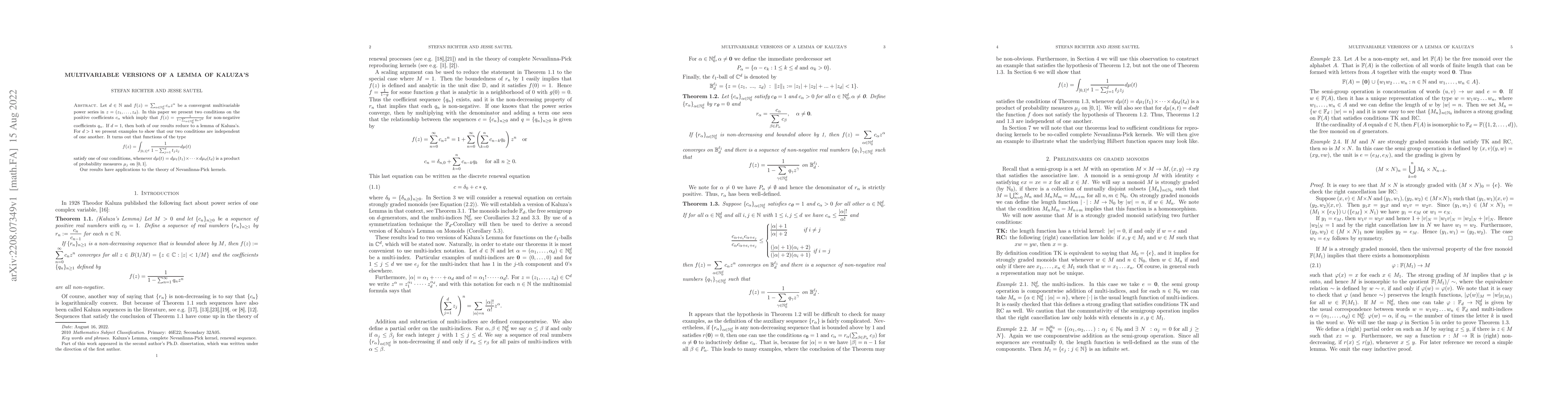This paper extends Kaluza's lemma to multivariable power series, presenting two independent conditions on coefficients that transform a given series into a specific form involving non-negative coefficients. Functions satisfying these conditions have applications in the theory of Nevanlinna-Pick kernels.