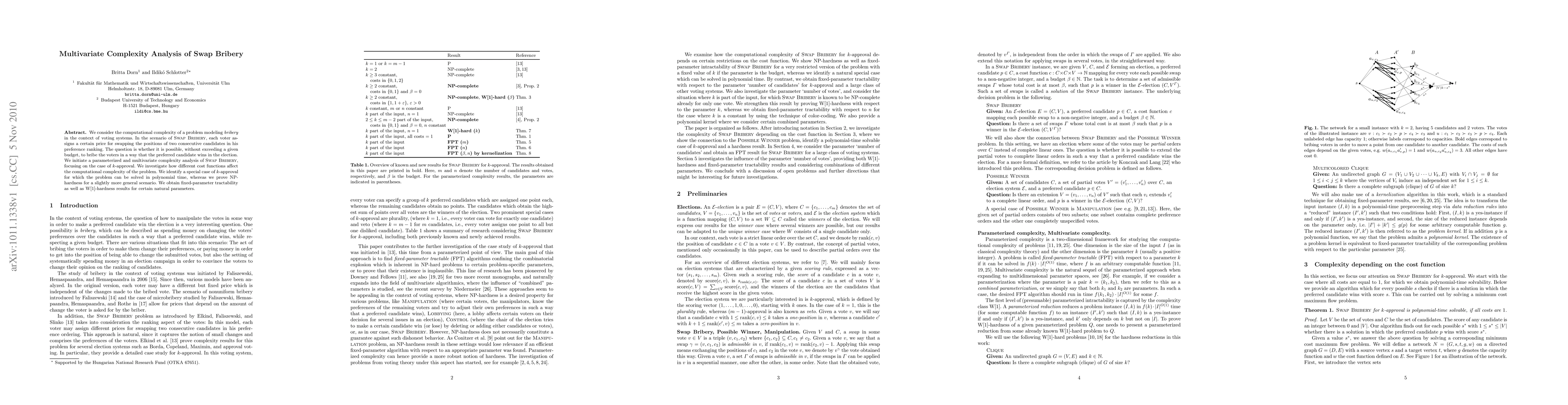 This paper analyzes the computational complexity of the Swap Bribery problem in voting systems, where voters assign prices to swap candidate positions. It finds polynomial-time solvability for a specific k-approval case but proves NP-hardness for a more general scenario, along with fixed-parameter tractability and W[1]-hardness results for certain parameters.