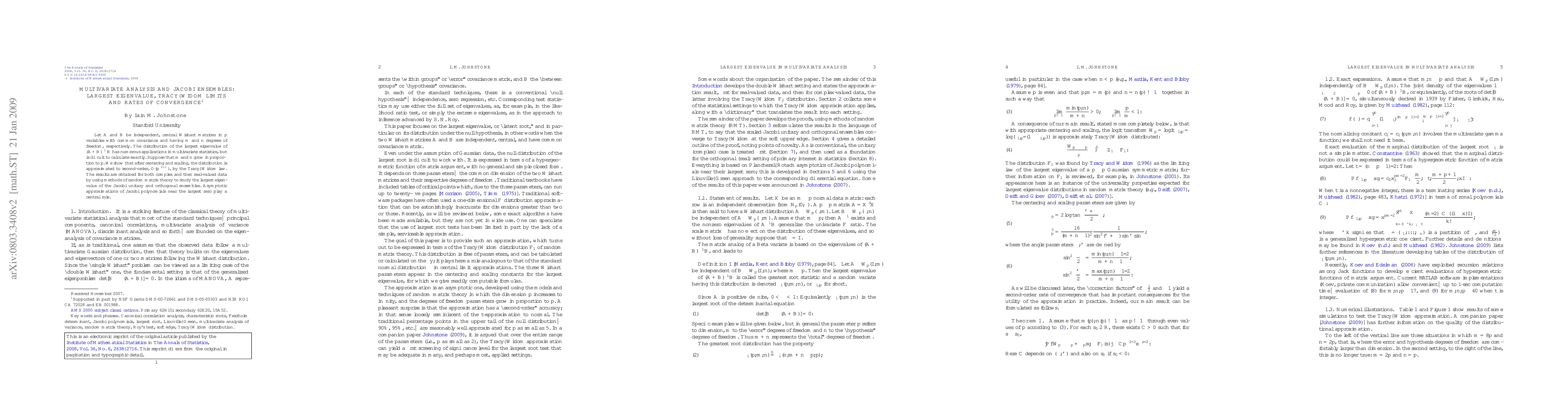 This research paper uses multivariate analysis and Jacobi ensembles to approximate the distribution of the largest eigenvalue of a specific matrix, showing it converges to the Tracy-Widom law at a rate of $O(p^{-2/3})$ as $m$ and $n$ grow in proportion to $p$. The results have implications for multivariate statistics and are valid for both complex and real-valued data.